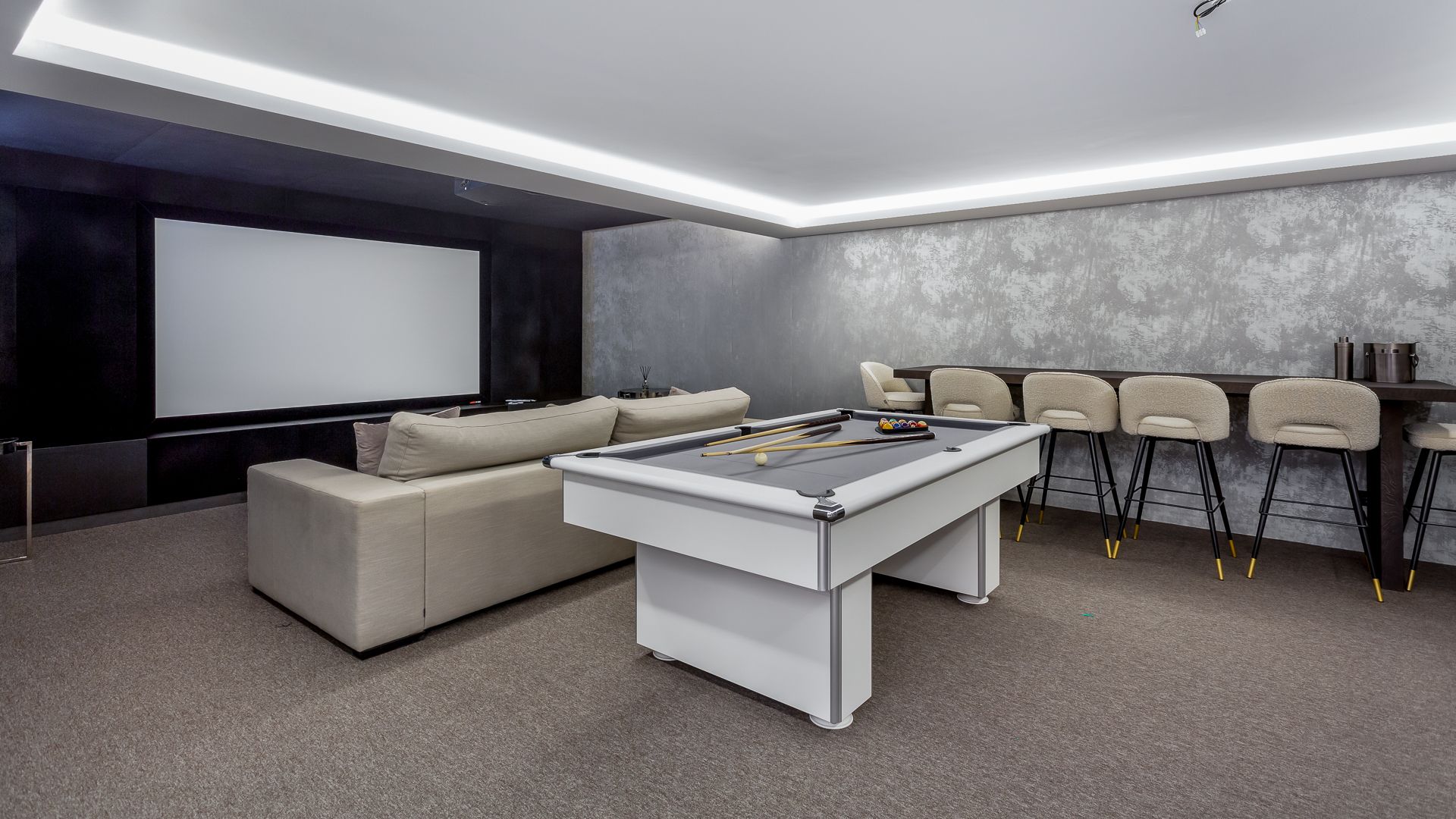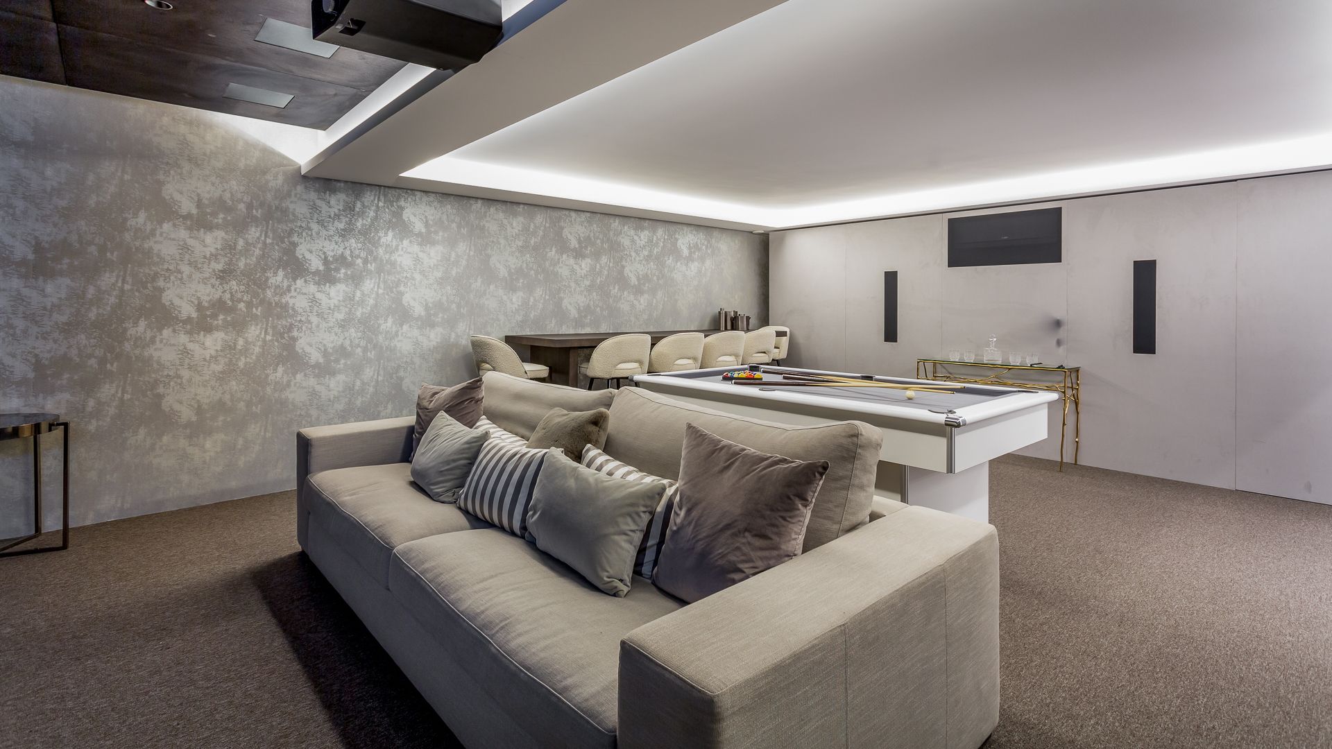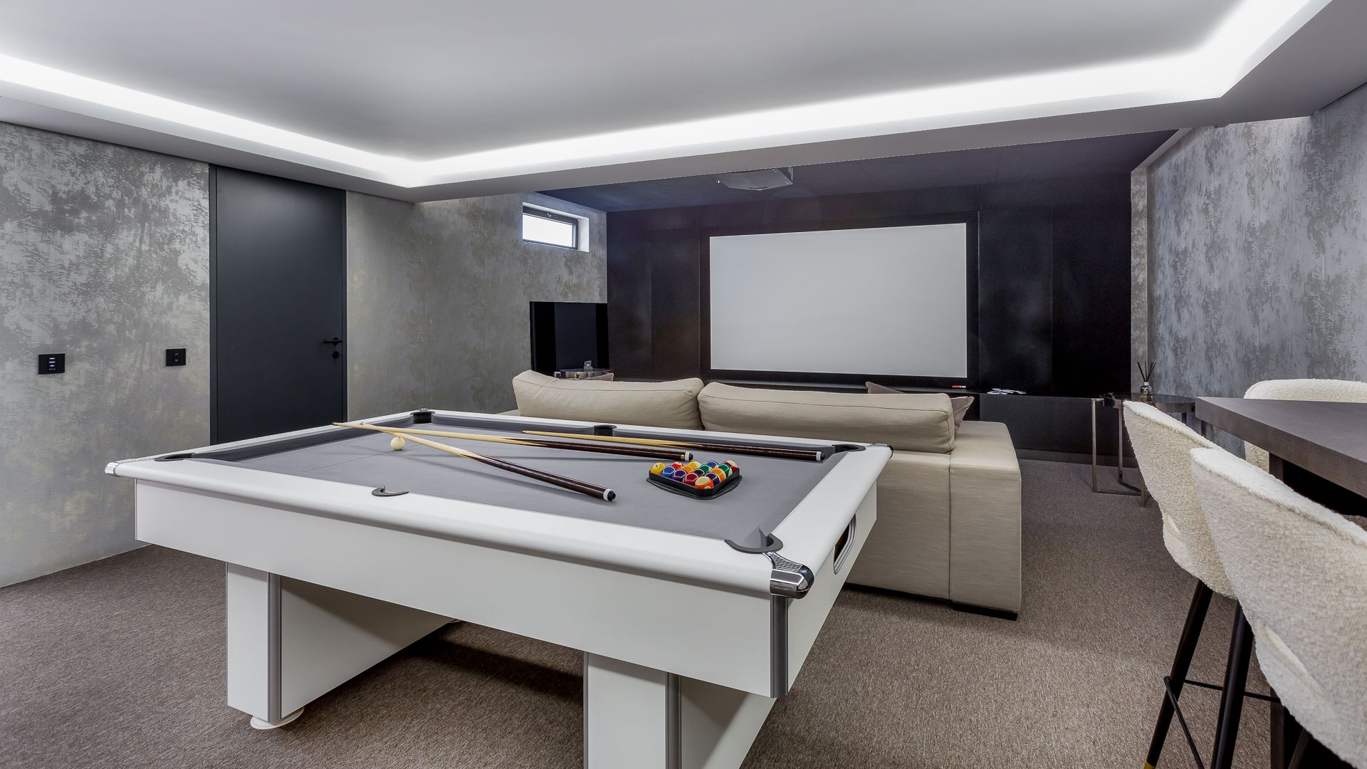 On the ground floor, there are also two beautifully decorated en suite double bedrooms, with windows leading you to the outside area and pool. Going through the beautiful stair case, you will have an enormous view to the outside leading to the first floor, where two en suite double bedrooms are located. With plenty of natural light so they are perfect for winding down after a busy day or enjoy a long bath by the window allowing the nature to flow through. Below the ground floor you will find one en suite double bedroom with a window leading you to the outside area and also a pool table, where you can enjoy your time with friends and family. Enjoy the sunshine outside with a refreshing drink, while you are cooking on the BBQ or laying on the sun loungers. Outside you can also enjoy a cool outdoor dining area, surrounded by the garden.