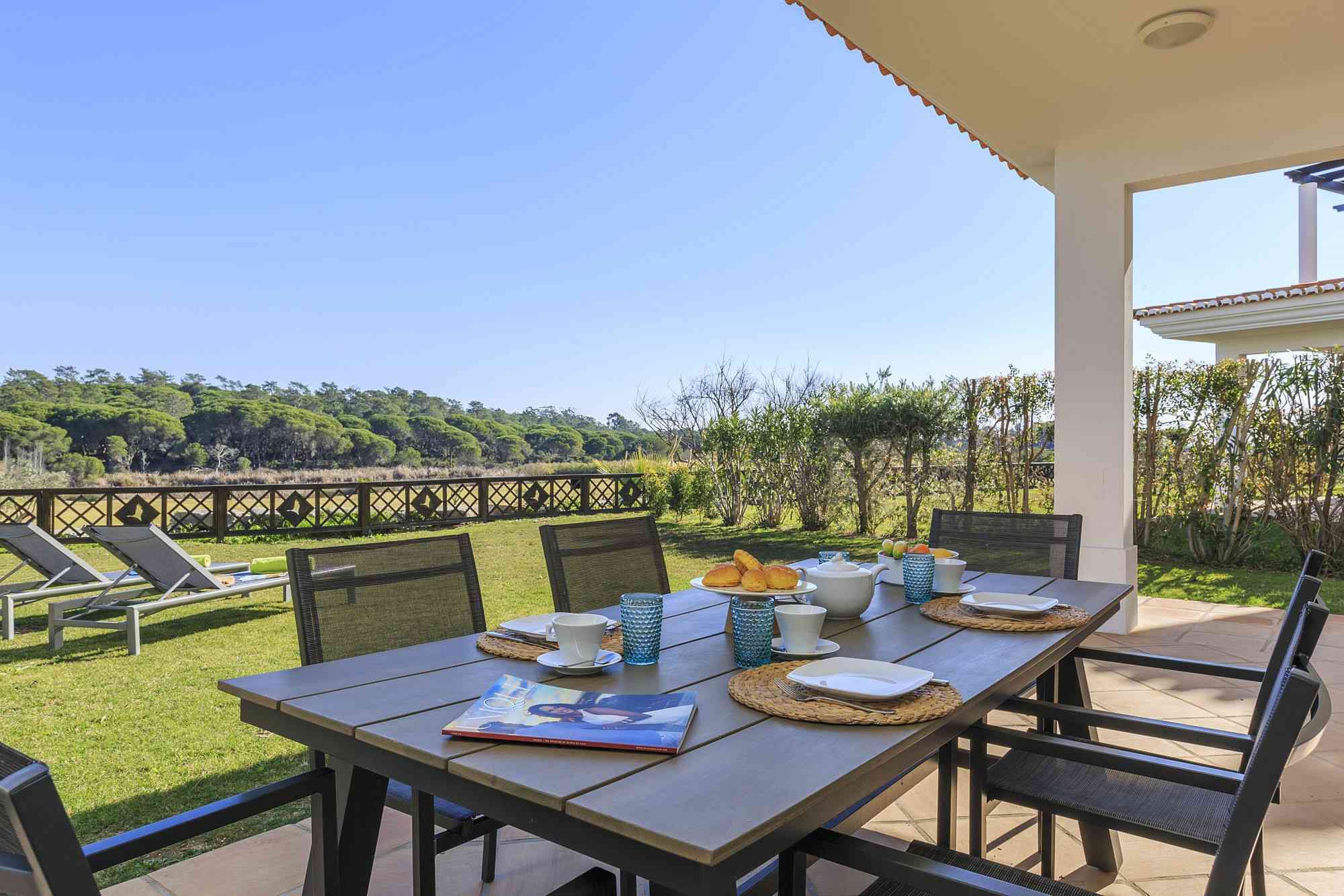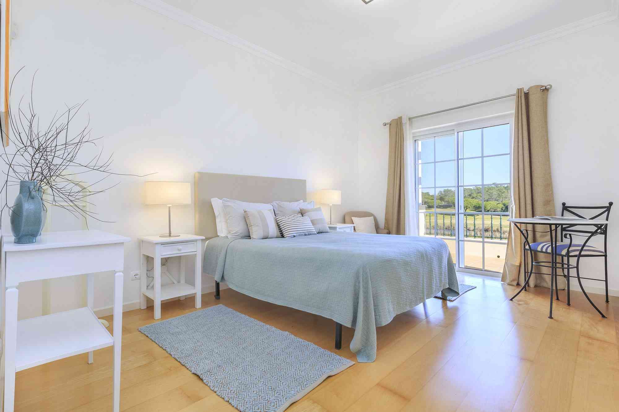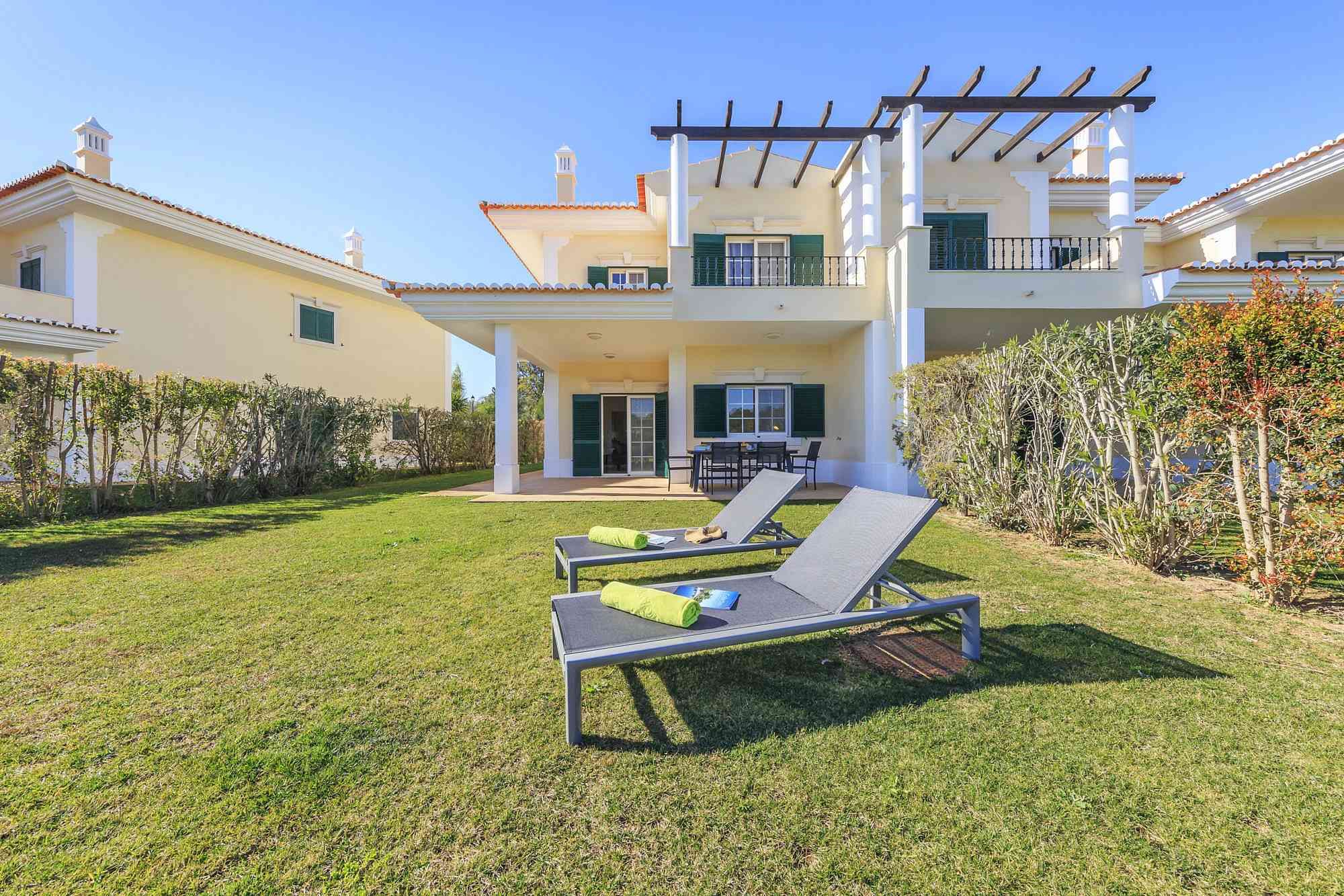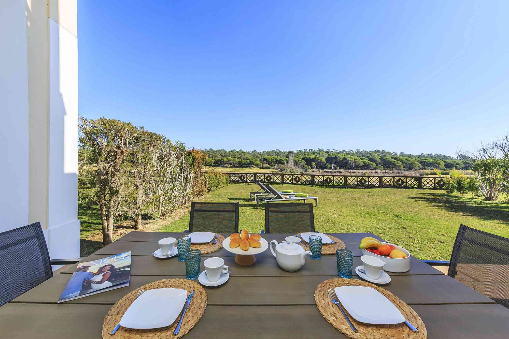 This unique golf-front 3-bedroom property is located next to the Pinheiros Altos Golf Course, with a magnificent view over the fairways and the Ria Formosa Natural Park. On the first floor there is a master suite with access to a private terrace and also a double room and a single room with a folding bed and a shared bathroom. On the ground floor there is a service bathroom with shower, a fully equipped kitchen and an open plan living / dining room with direct access to the private garden and a covered terrace with BBQ where you can enjoy meals outdoors in the warm climate. Just a short walk away, you can enjoy a communal swimming pool with spectacular views over the golf course. During your stay you can take advantage of air conditioning, alarm system, TV and Wi-Fi service and parking outside the property.