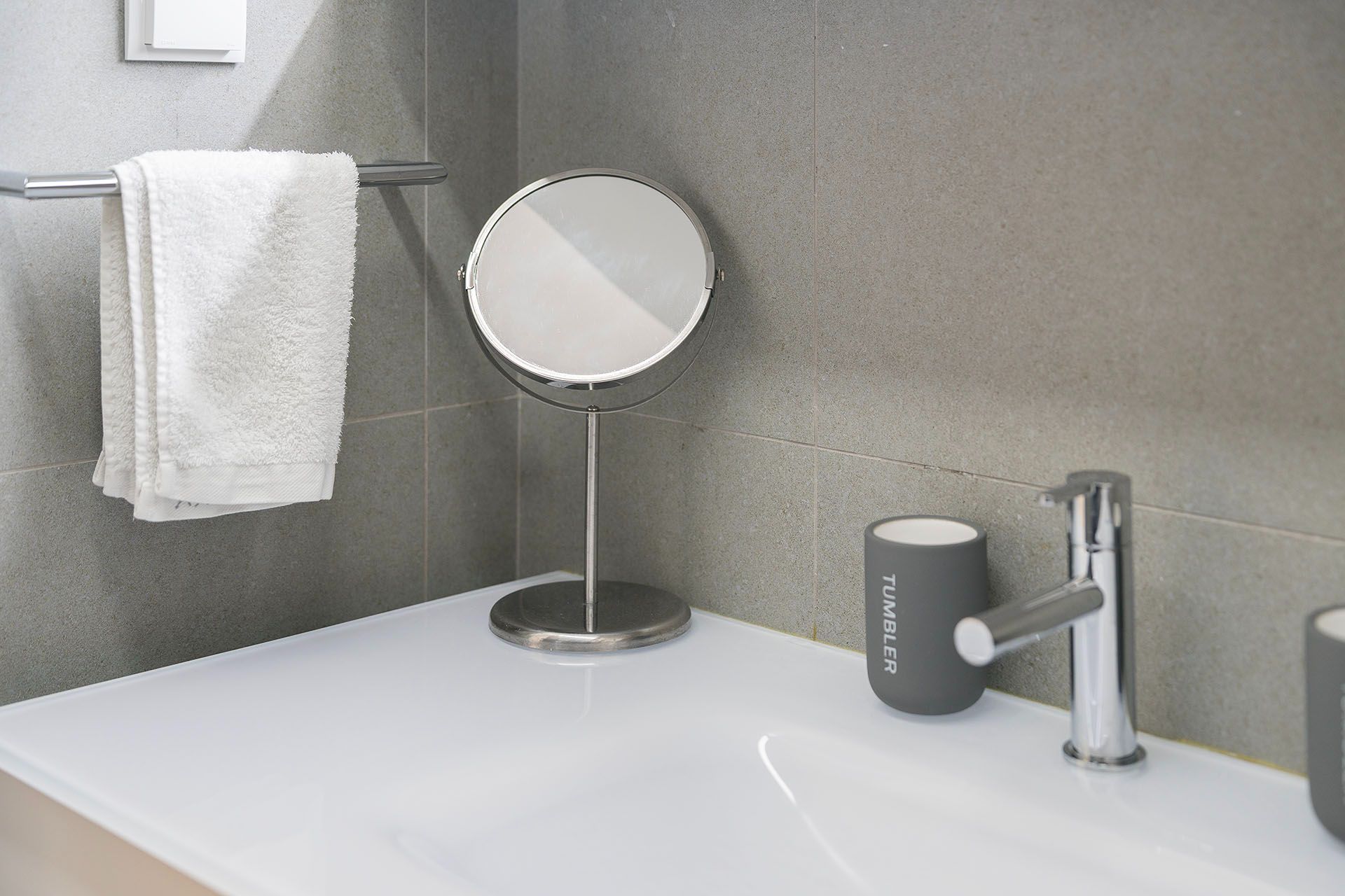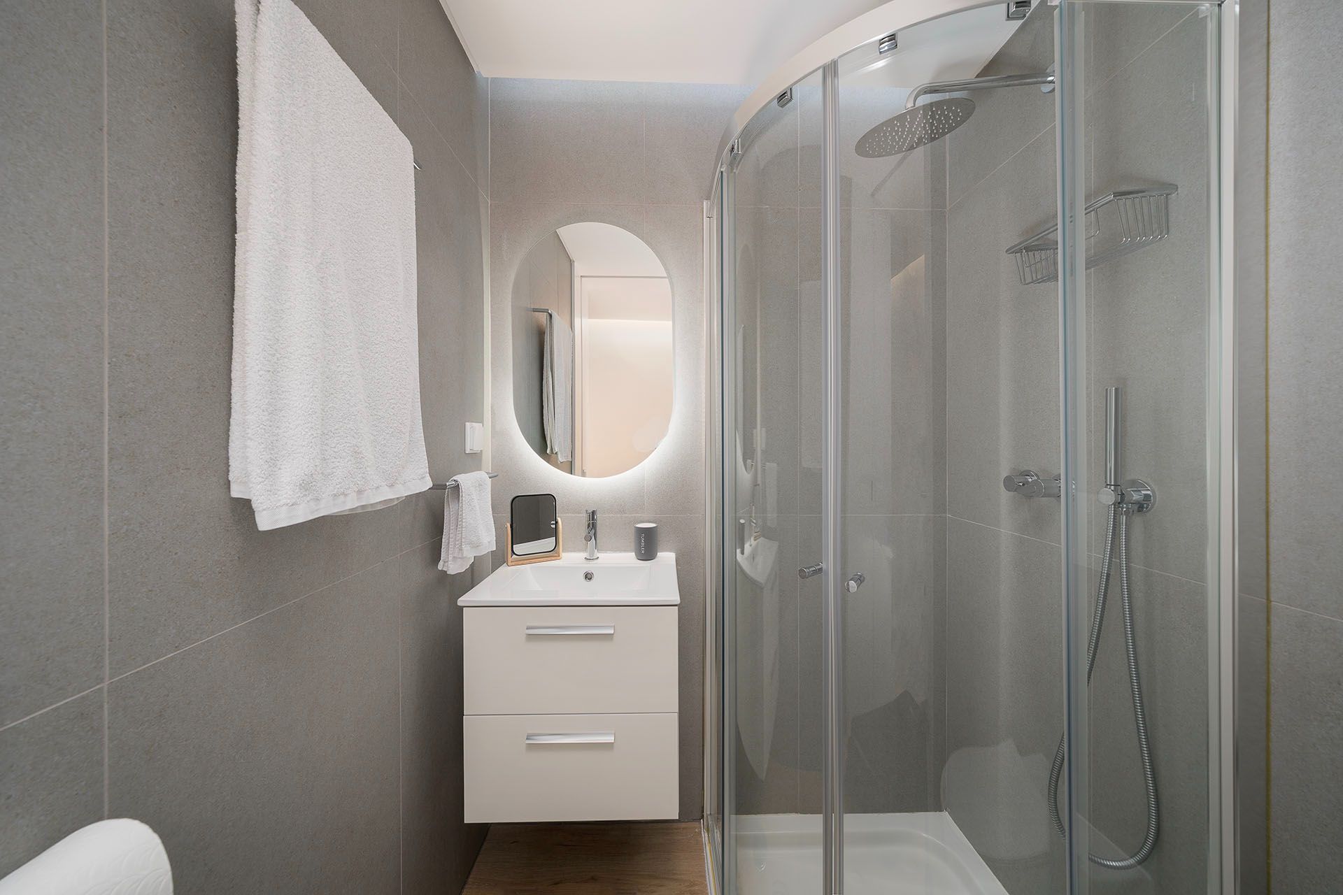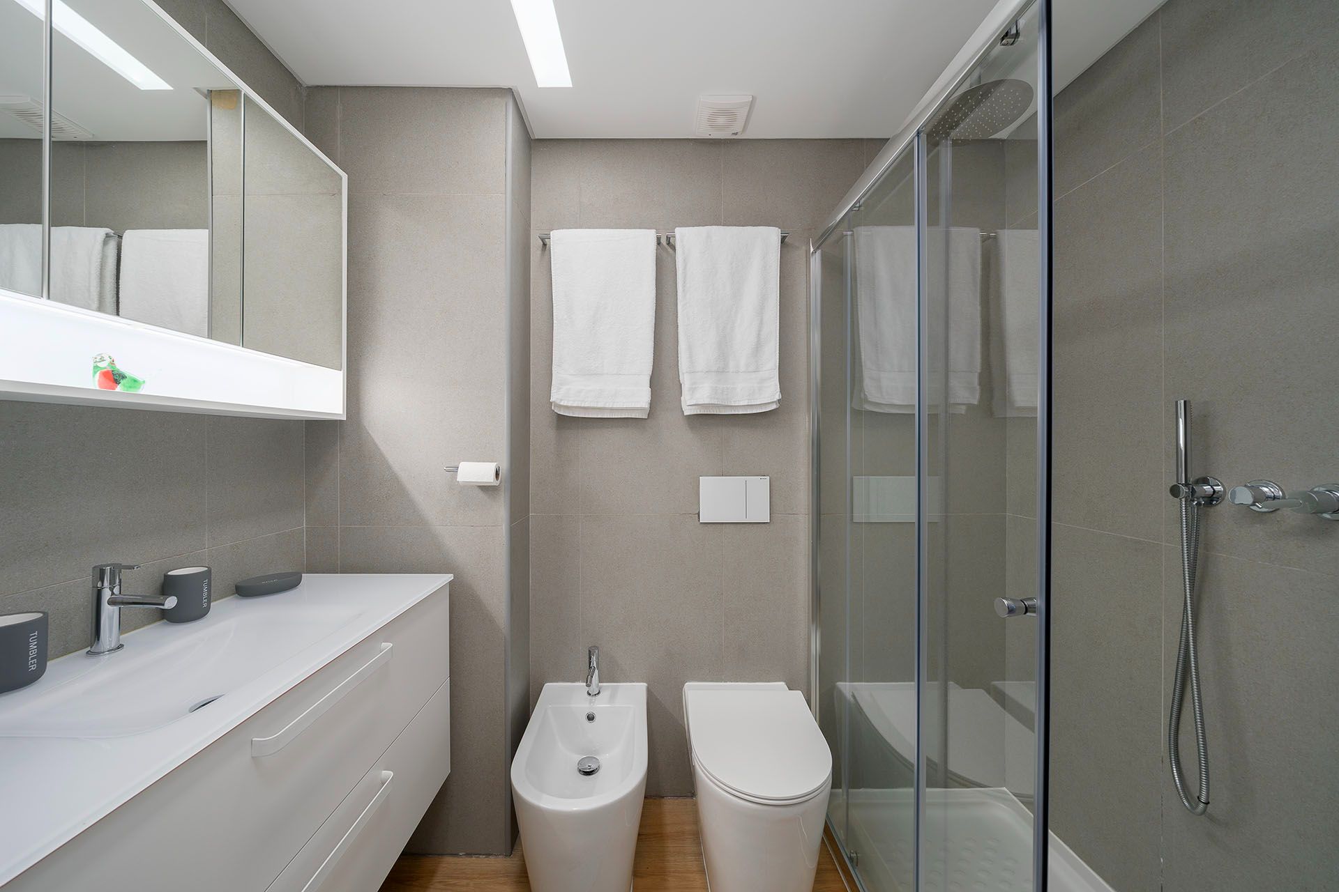 The apartment features an en-suite bedroom with twin beds convertible into a double, offering flexibility and comfort. The interior spaces are practical and welcoming, with two bathrooms providing added convenience throughout the stay.