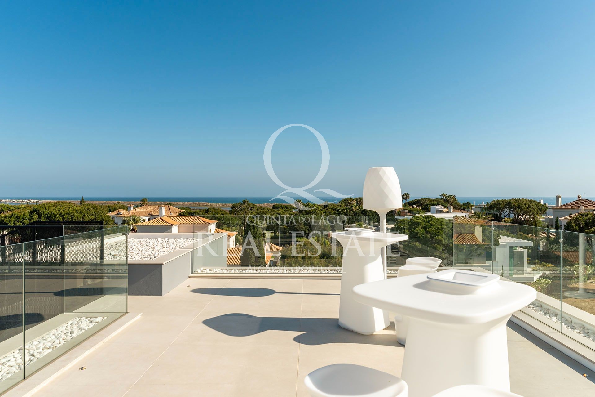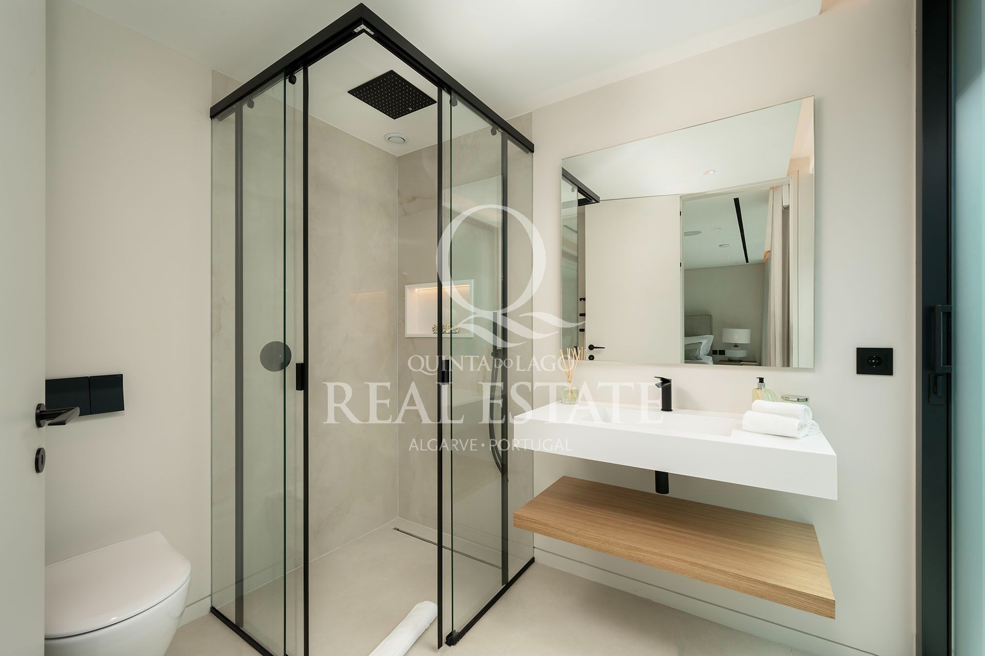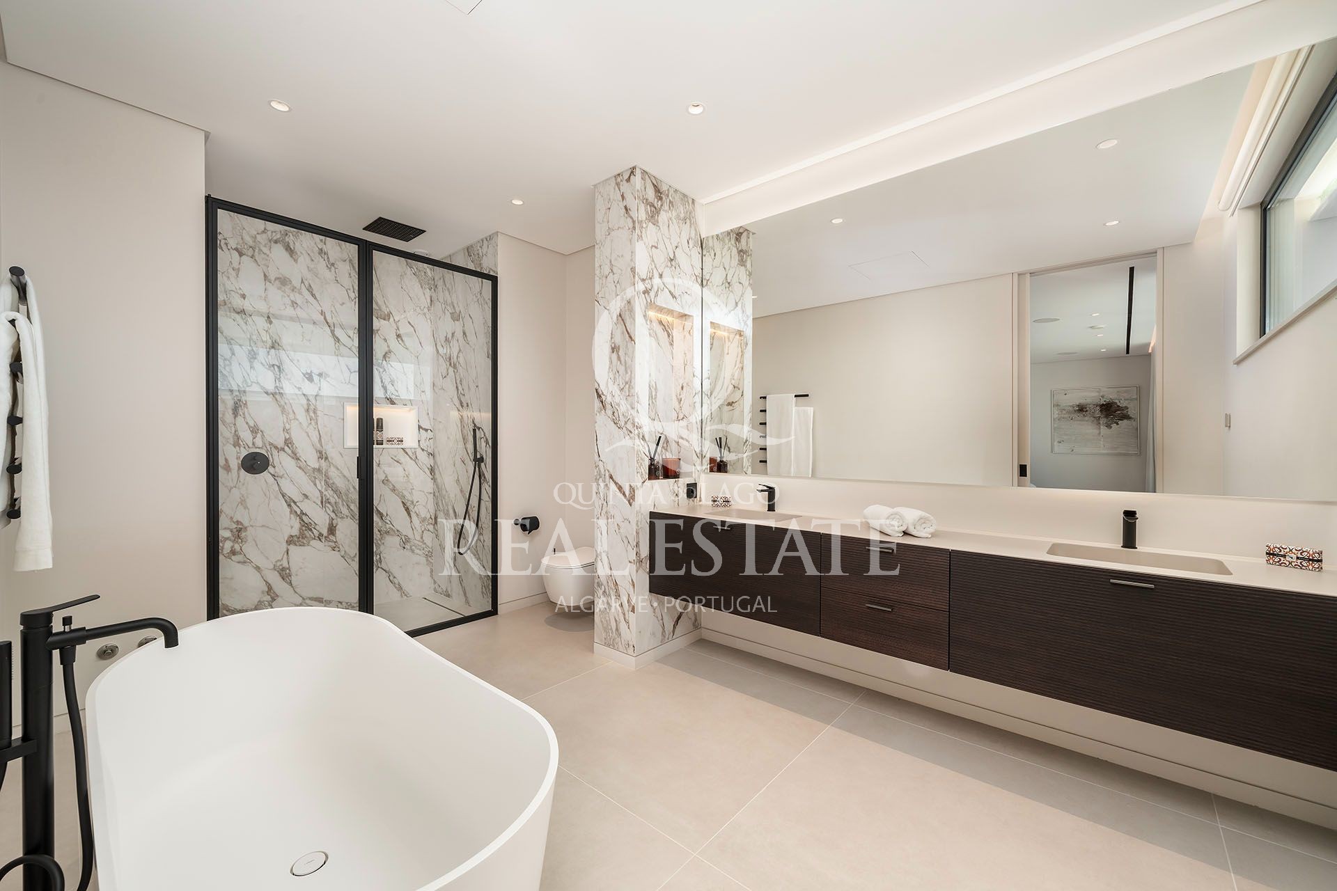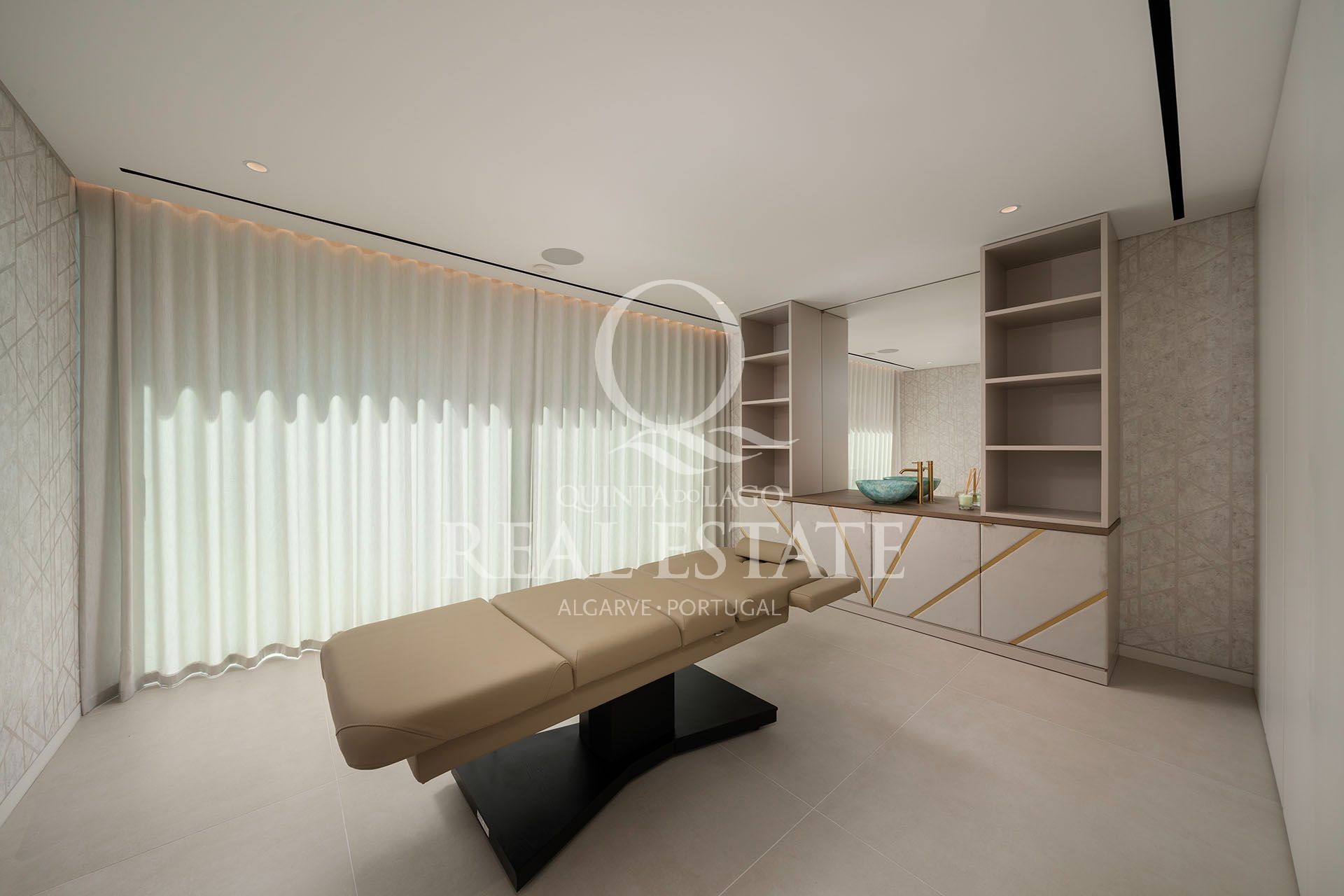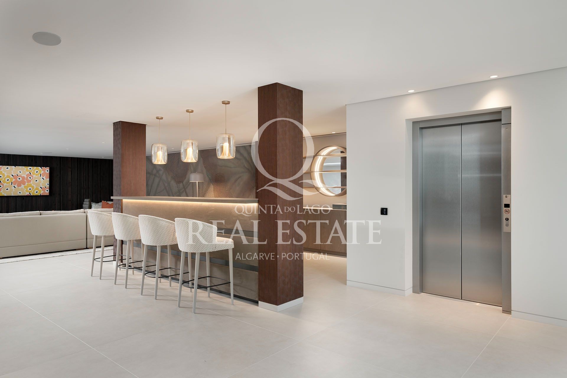 This attractive contemporary lakefront villa makes quite an impressive statement with an inviting double-height entrance hall and cloakroom. Designed over 3 floors, its layout is equally impressive, with a convenient lift granting easy access to all floors, including the top-floor sun terrace replete with a bar, a lounging area, spectacular 360-degree panoramic views of the sea, and the mature green landscaped gardens of the Atlantico property area. Adding to the charm of this residence is the spiral staircase that leads to the crow’s nest, designed with ample space to embrace the fabulous views of the sea and the natural beauty of the Ria Formosa Nature Reserve that unfolds at every turn.