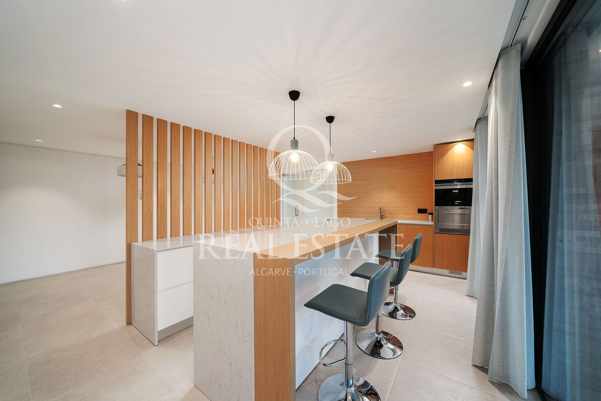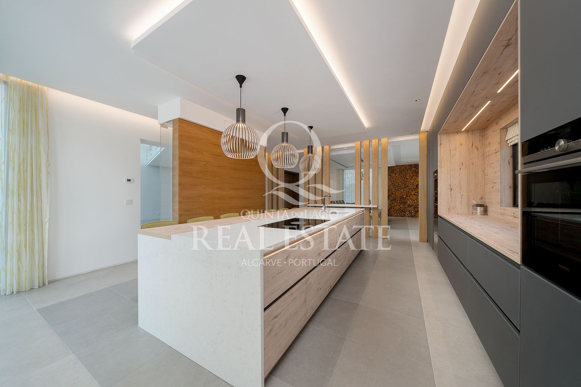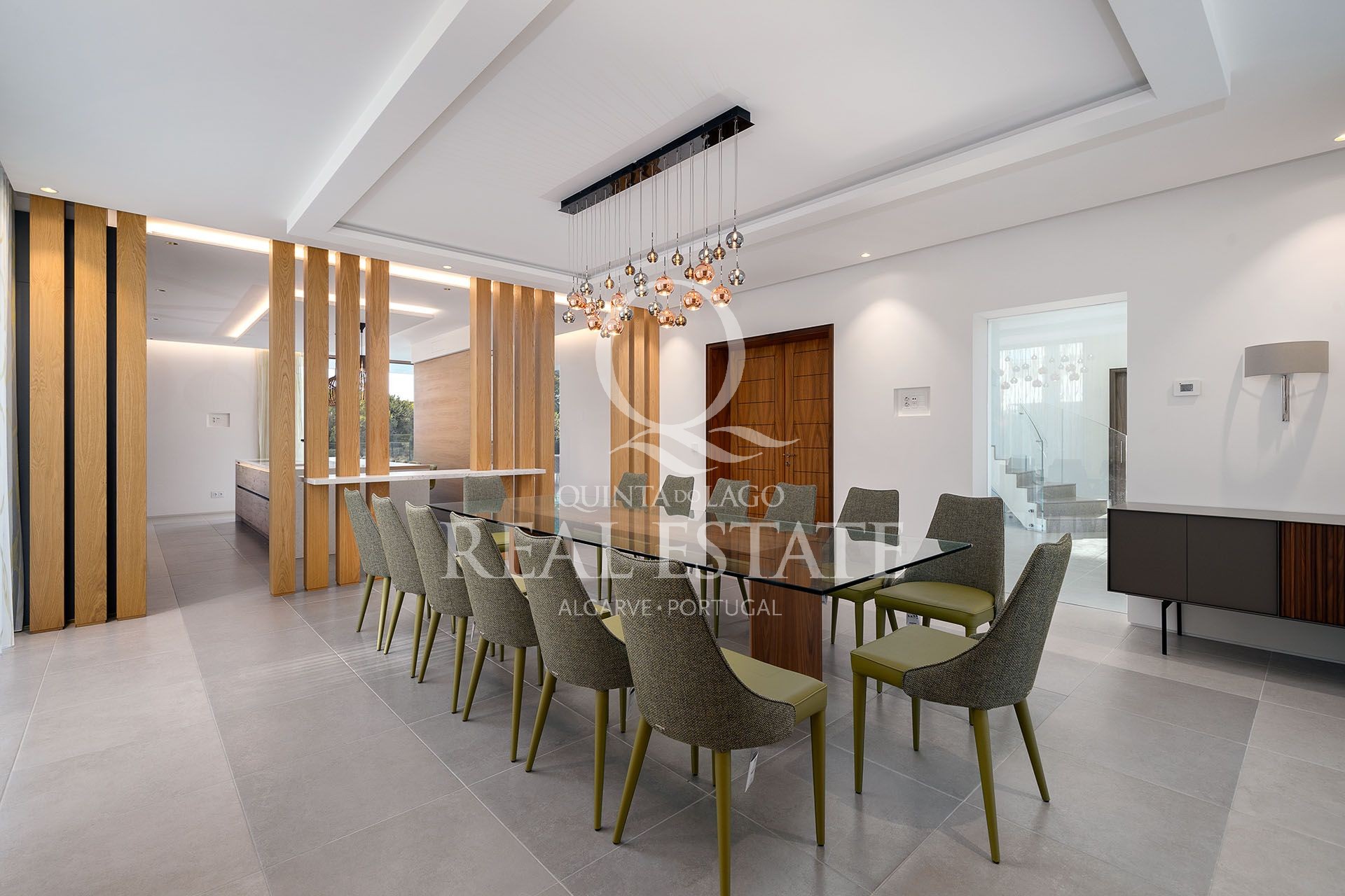 To the right-hand side, a large open plan designer kitchen is fully equipped and overlooks the outdoor terraces, swimming pool and fully landscaped Mediterranean gardens; the kitchen is complete with a very elegant open plan dining room, that blends in beautifully with the kitchen and allows for a great entertaining experience.
