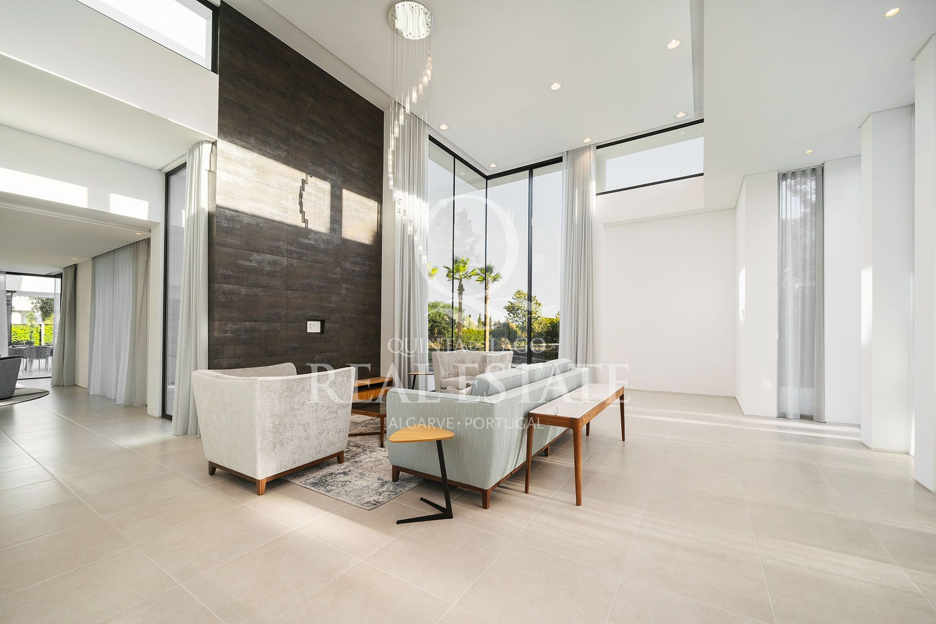 From here, one can find two grand linked reception rooms, which will be a delight for entertaining guests and family, as well as more quiet areas, such as the office and an adjacent snug/TV area. One of the lounge areas has a double-sided fireplace, and all spaces receive natural light due to the double height ceilings and corresponding floor to ceiling automated sliding windows.