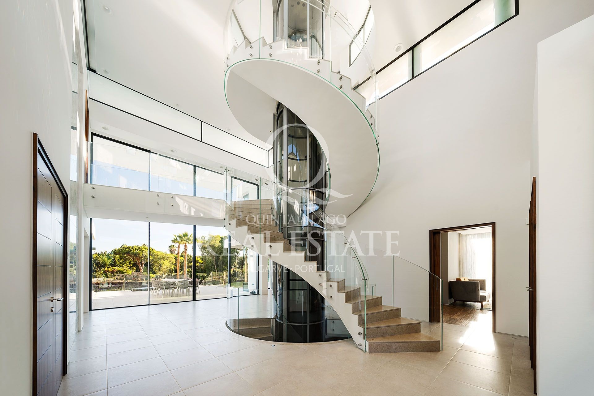 The grand entrance atrium is a true work of art, with a circular glass lift and staircase for all three levels, at the very heart of the villa.