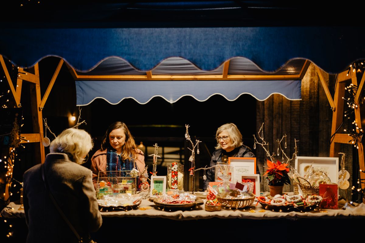 Um encantador Mercado de Natal com artesanato, iguarias regionais e deliciosas especialidades festivas.