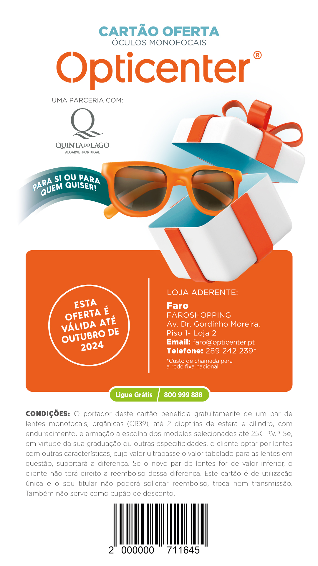 *O portador deste cartão beneficia gratuitamente de um par de lentes monofocais, orgânicas (CR39), até 2 dioptrias de esfera e cilindro, com endurecimento, e armação à escolha dos modelos selecionados até 25€.