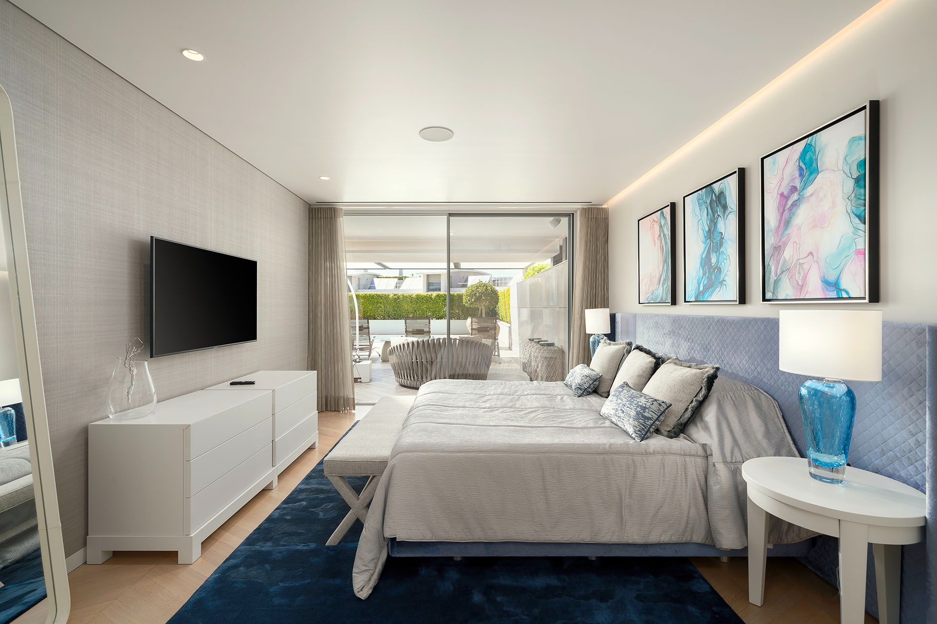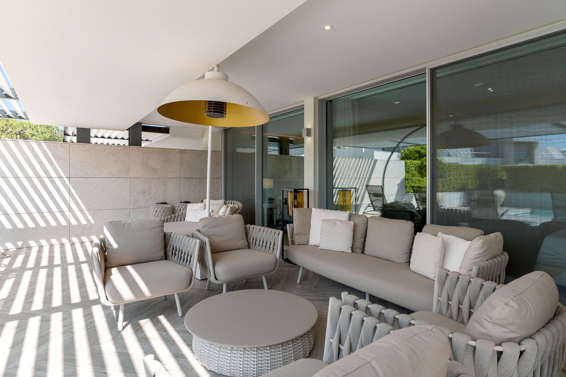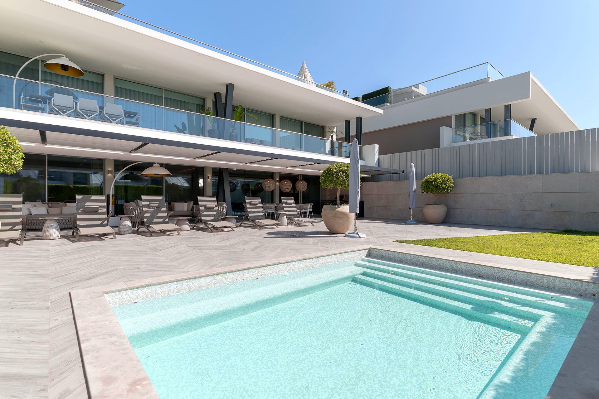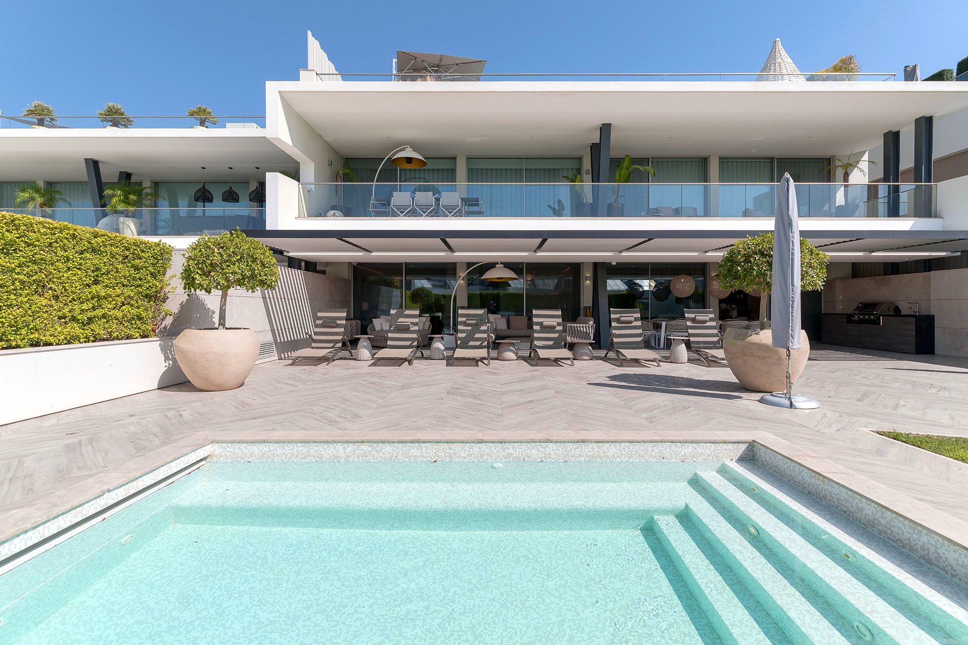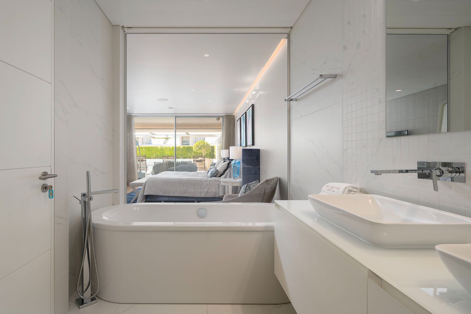 Este deslumbrante apartamento garden, é uma combinação de design arquitetónico único e simples e luxuoso, com quatro quartos e cinco casas de banho e acabamentos de alto padrão. As áreas de estar de plano aberto, claras e espaçosas, fluem naturalmente para o espaço ao ar livre, completos com área para refeições ao ar livre e piscina privativa. O apartamento acomoda até 8 pessoas, com o quarto principal, 2 quartos duplos e um quarto twin, todos com casa de banho privativa. A propriedade inclui uma cozinha totalmente equipada com eletrodomésticos e móveis de luxo, área de estar e jantar e garagem.