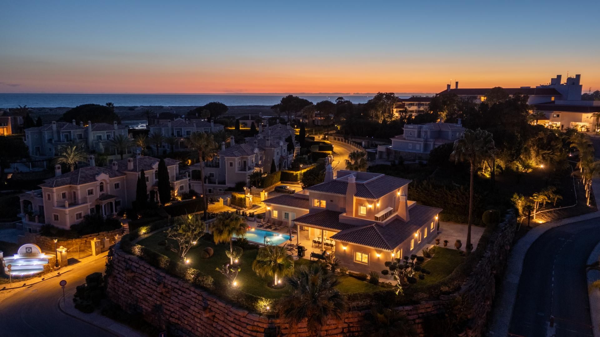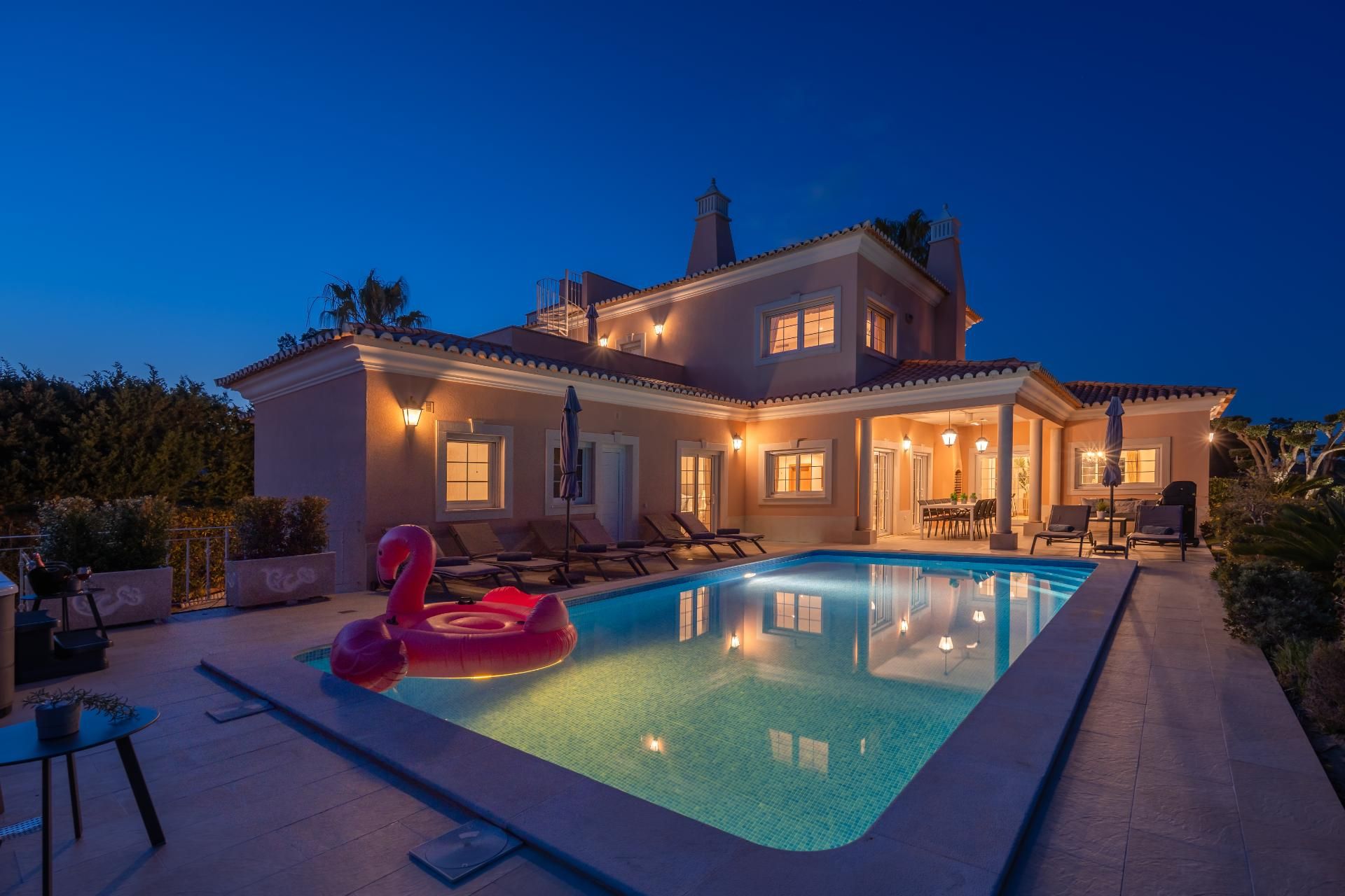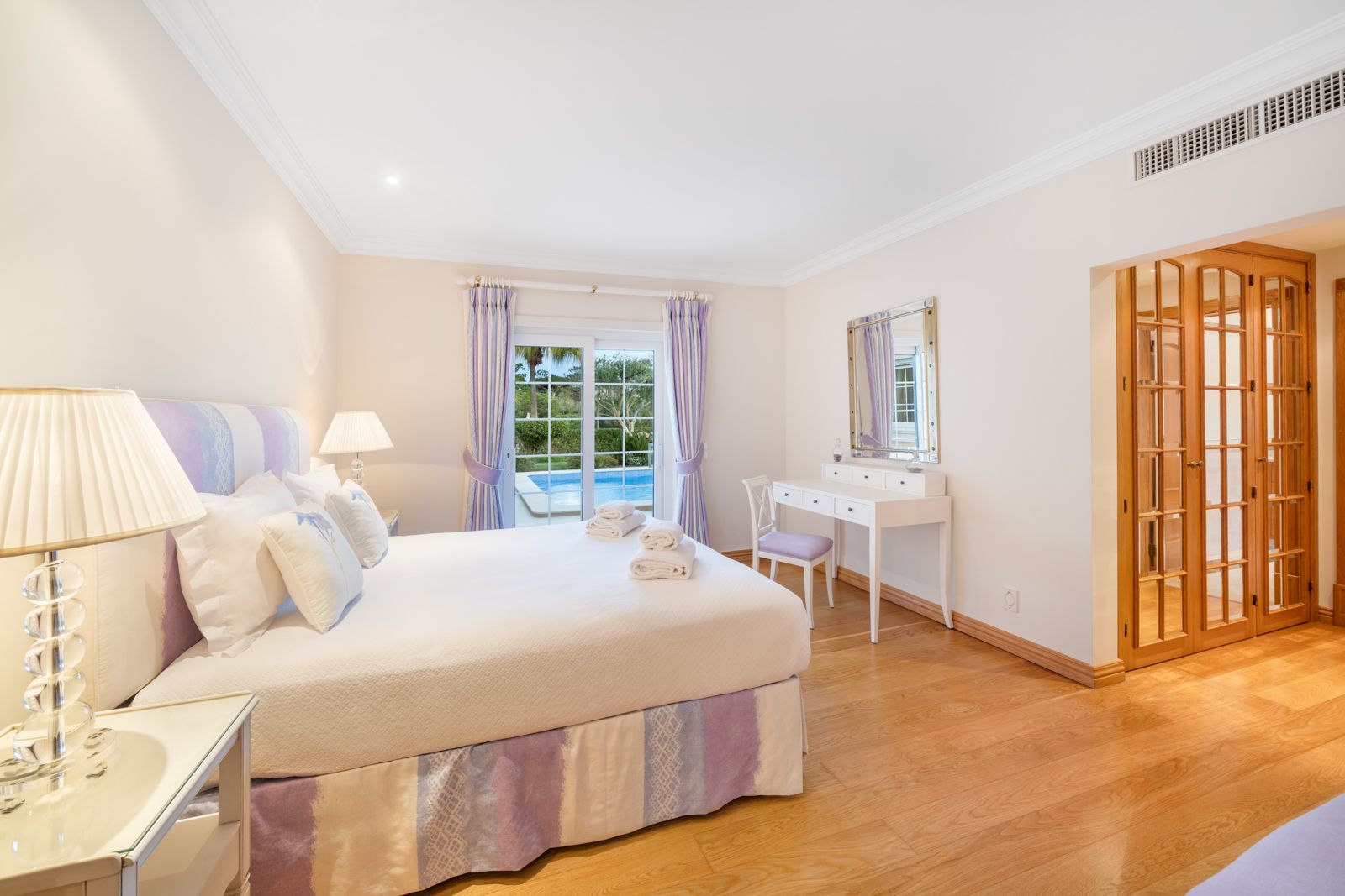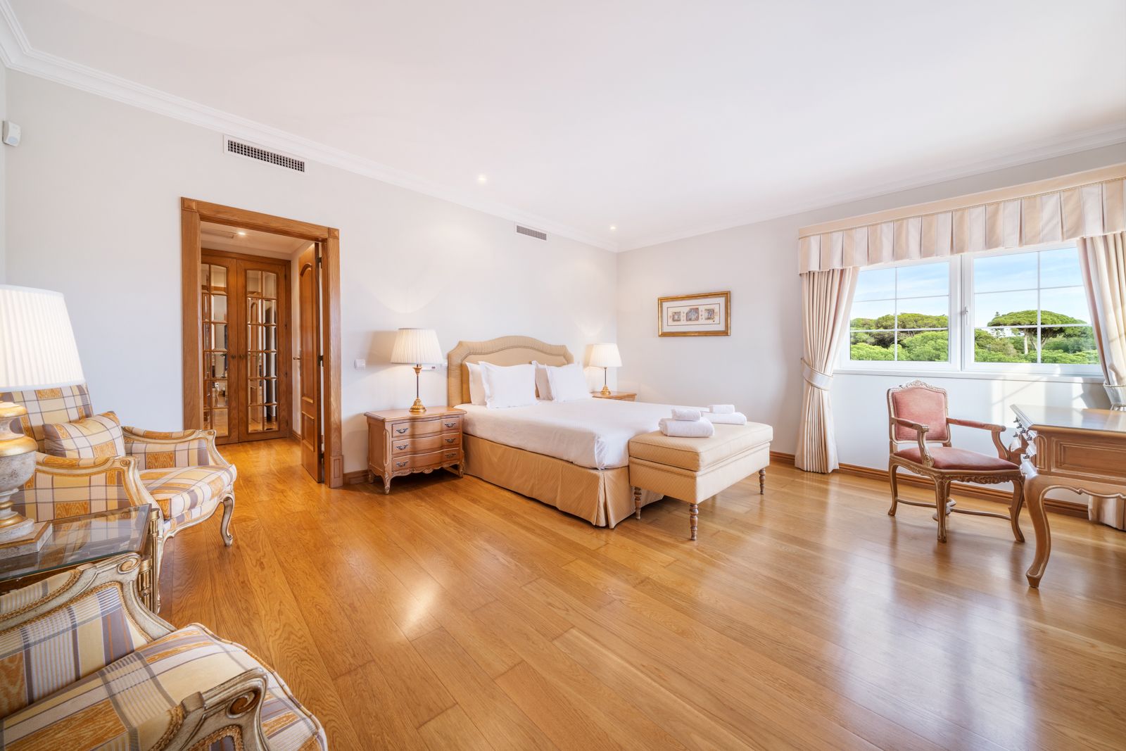 Ao entrar nesta moradia, uma majestosa escada recebe-o e leva-o até ao primeiro andar, onde encontrará o quarto principal com lareira e casa de banho privativa, com banheira e chuveiro. No piso térreo encontra-se a sala de estar, muito confortável, com TV plasma. As janelas do pátio conduzem-no ao terraço do BBQ e à magnífica piscina. Neste piso, além de um escritório com casa de banho, encontrará ainda uma elegante sala de jantar, com acesso a uma cozinha totalmente equipada.