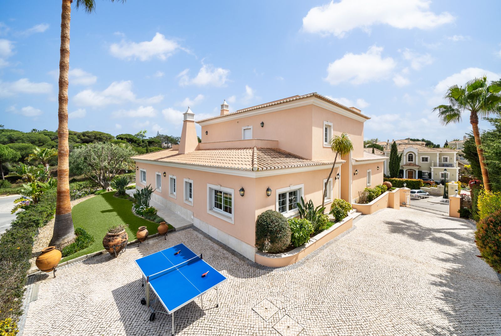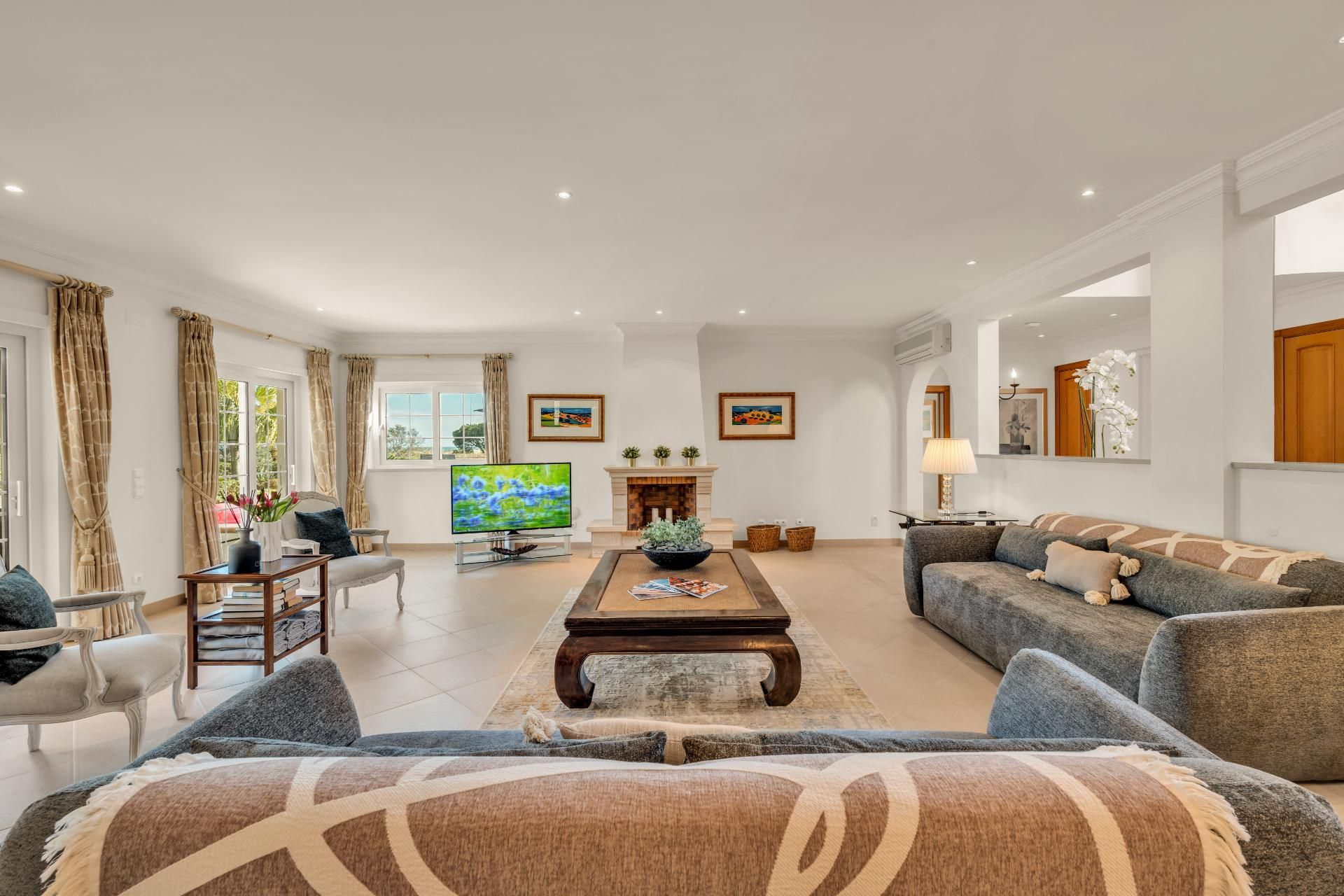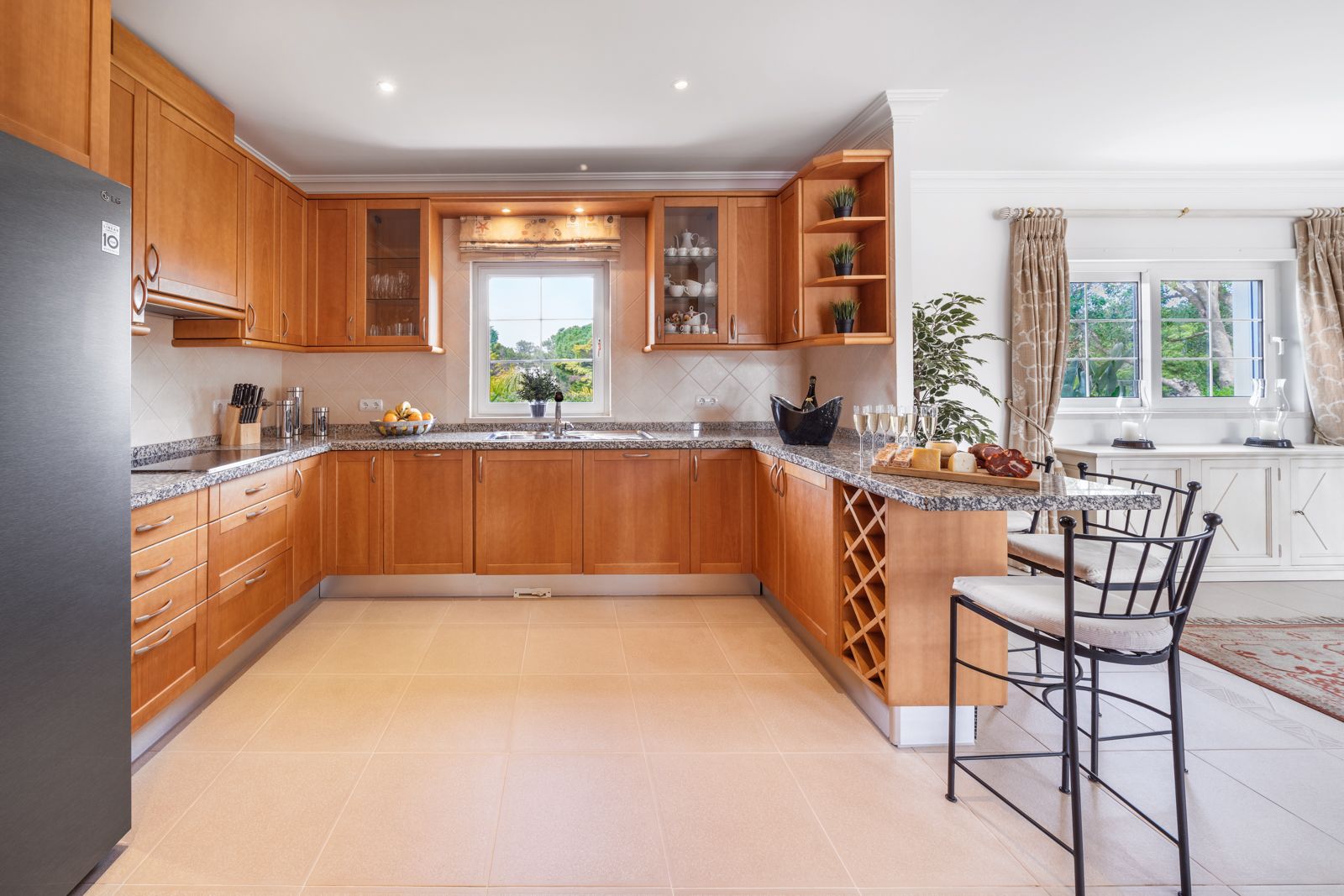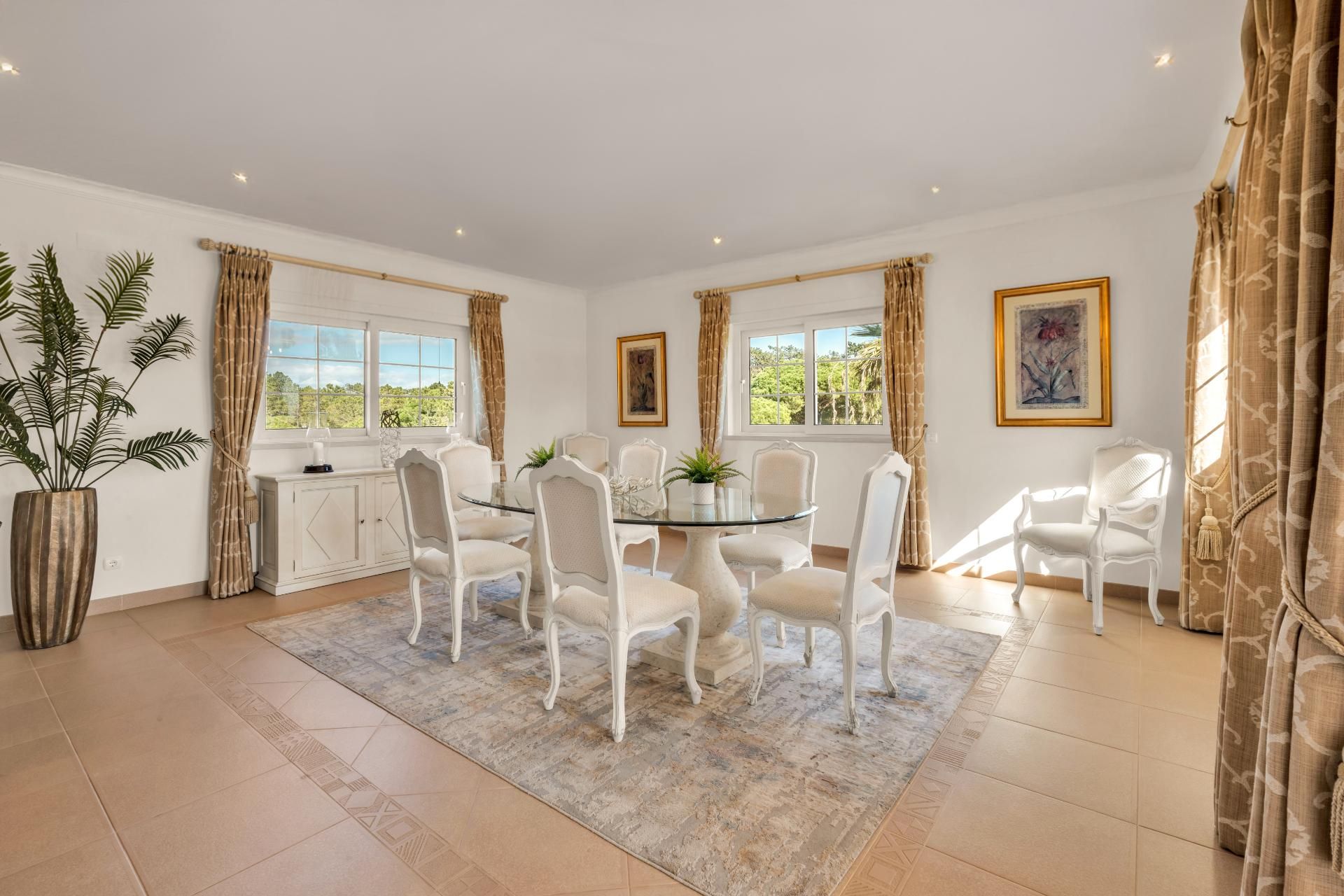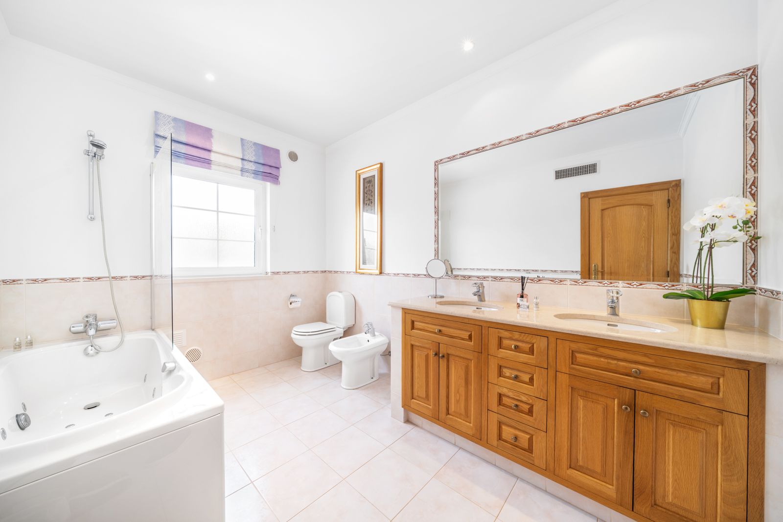 Ao entrar nesta moradia, uma majestosa escada recebe-o e leva-o até ao primeiro andar, onde encontrará o quarto principal com lareira e casa de banho privativa, com banheira e chuveiro. No piso térreo encontra-se a sala de estar, muito confortável, com TV plasma. As janelas do pátio conduzem-no ao terraço do BBQ e à magnífica piscina. Neste piso, além de um escritório com casa de banho, encontrará ainda uma elegante sala de jantar, com acesso a uma cozinha totalmente equipada.