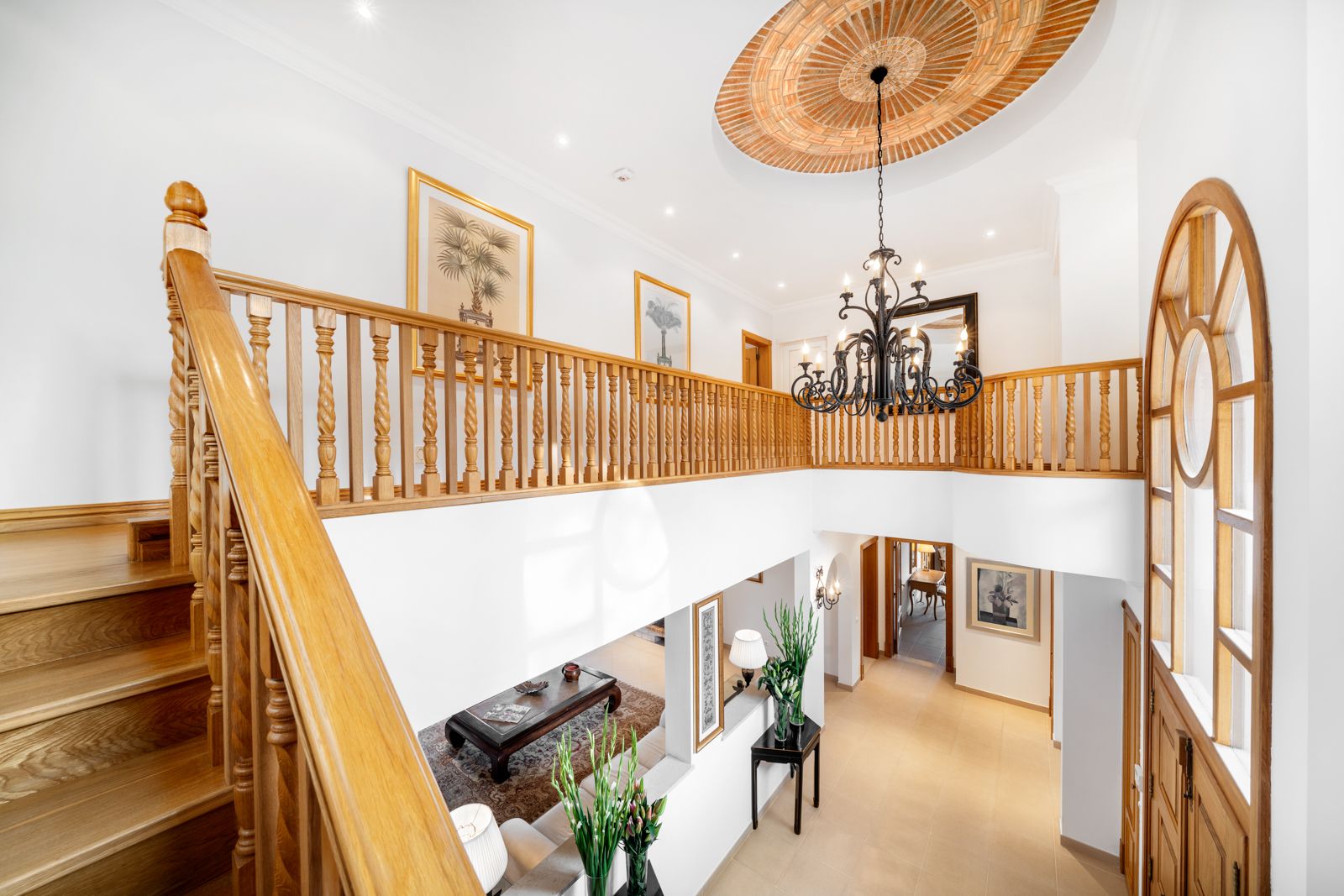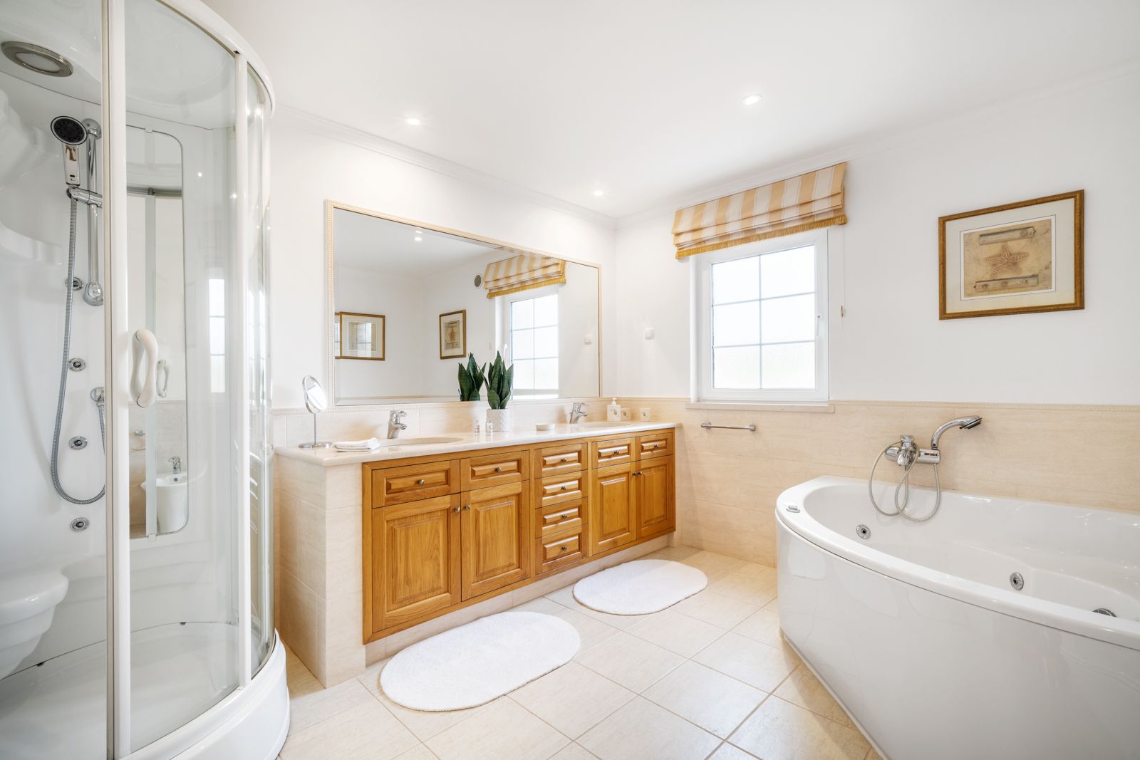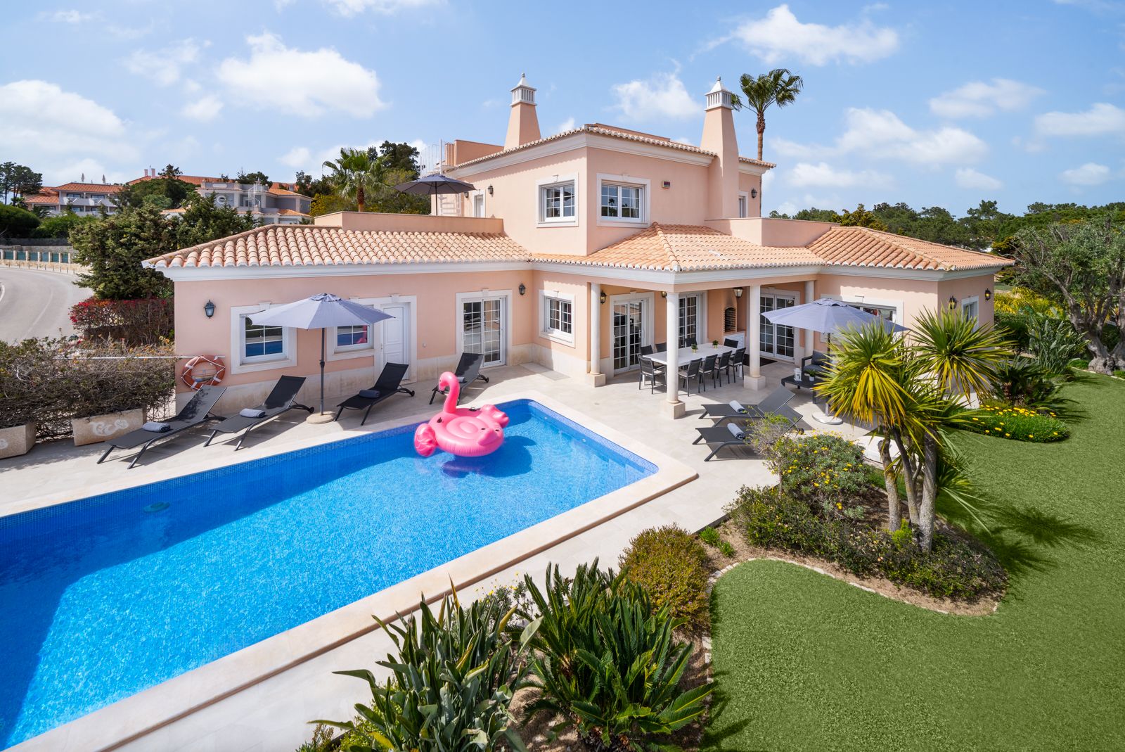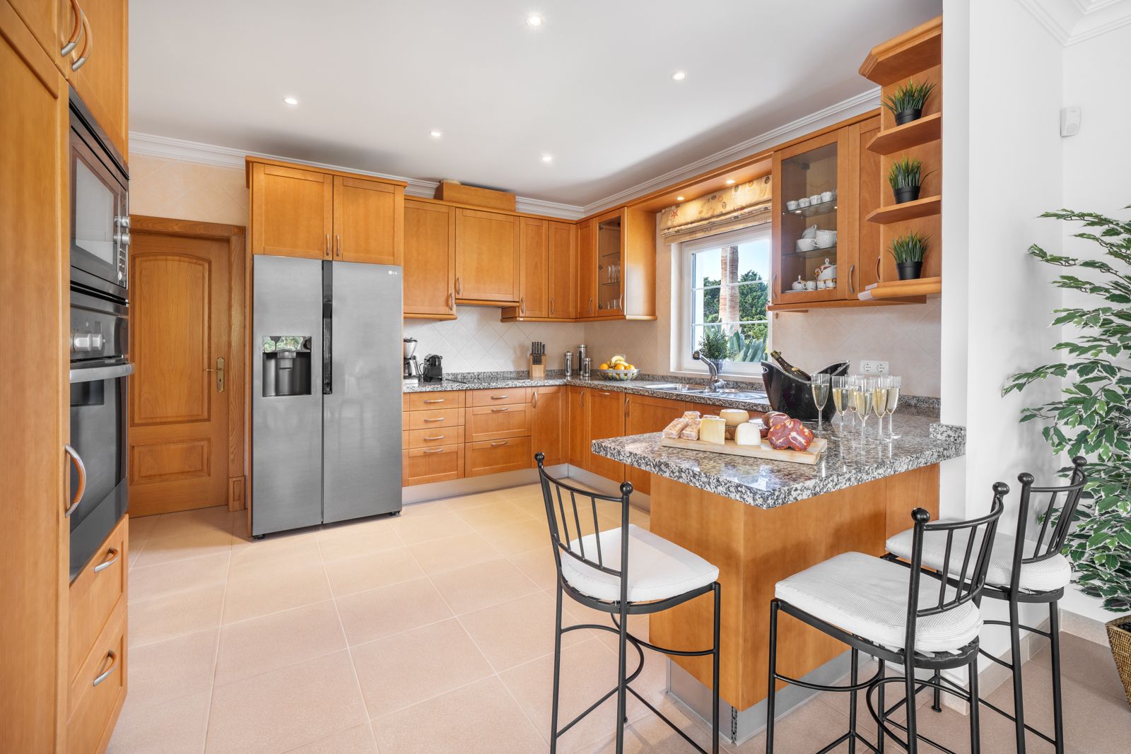 Ao entrar nesta moradia, uma majestosa escada recebe-o e leva-o até ao primeiro andar, onde encontrará o quarto principal com lareira e casa de banho privativa, com banheira e chuveiro. No piso térreo encontra-se a sala de estar, muito confortável, com TV plasma. As janelas do pátio conduzem-no ao terraço do BBQ e à magnífica piscina. Neste piso, além de um escritório com casa de banho, encontrará ainda uma elegante sala de jantar, com acesso a uma cozinha totalmente equipada.