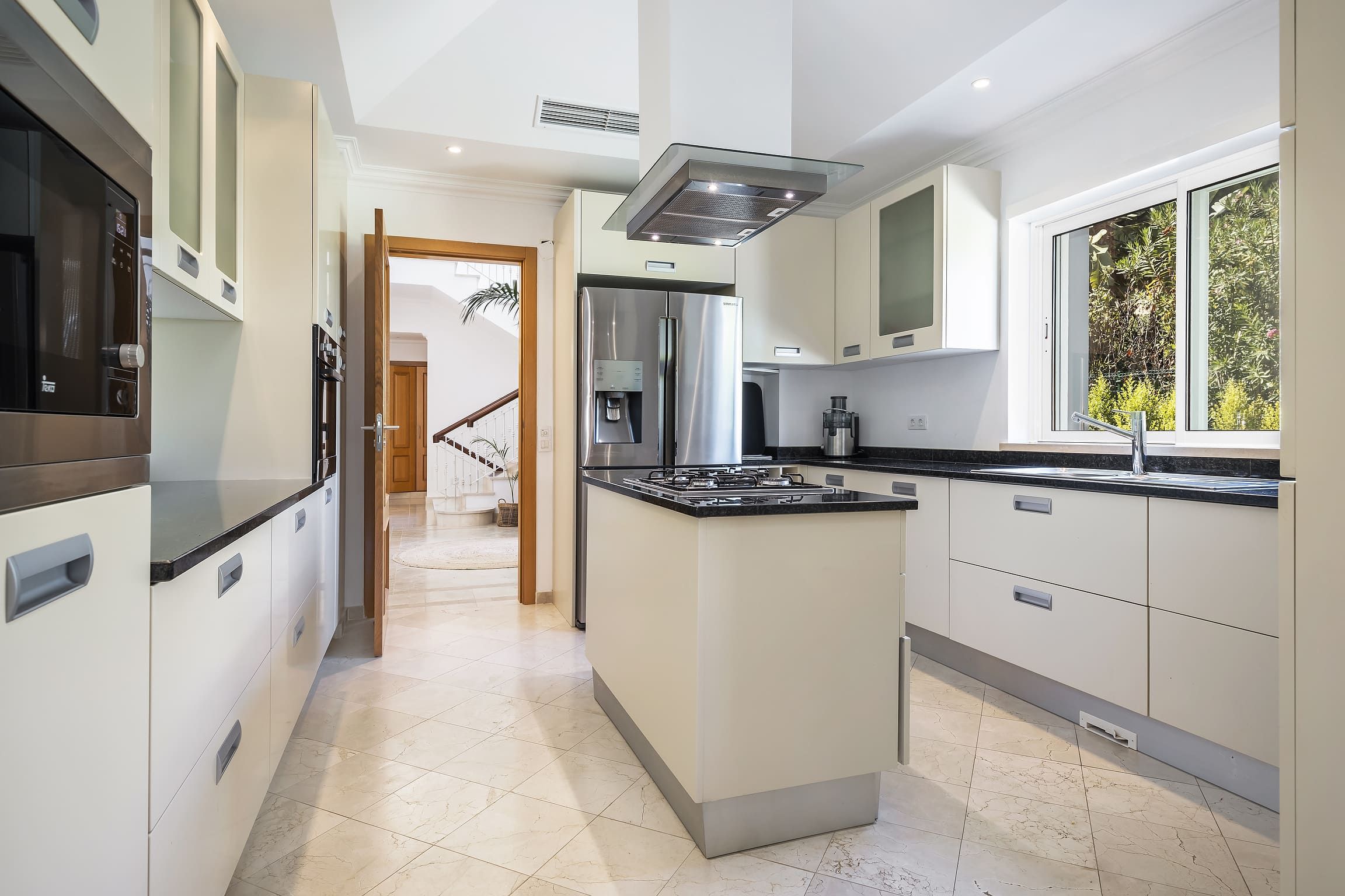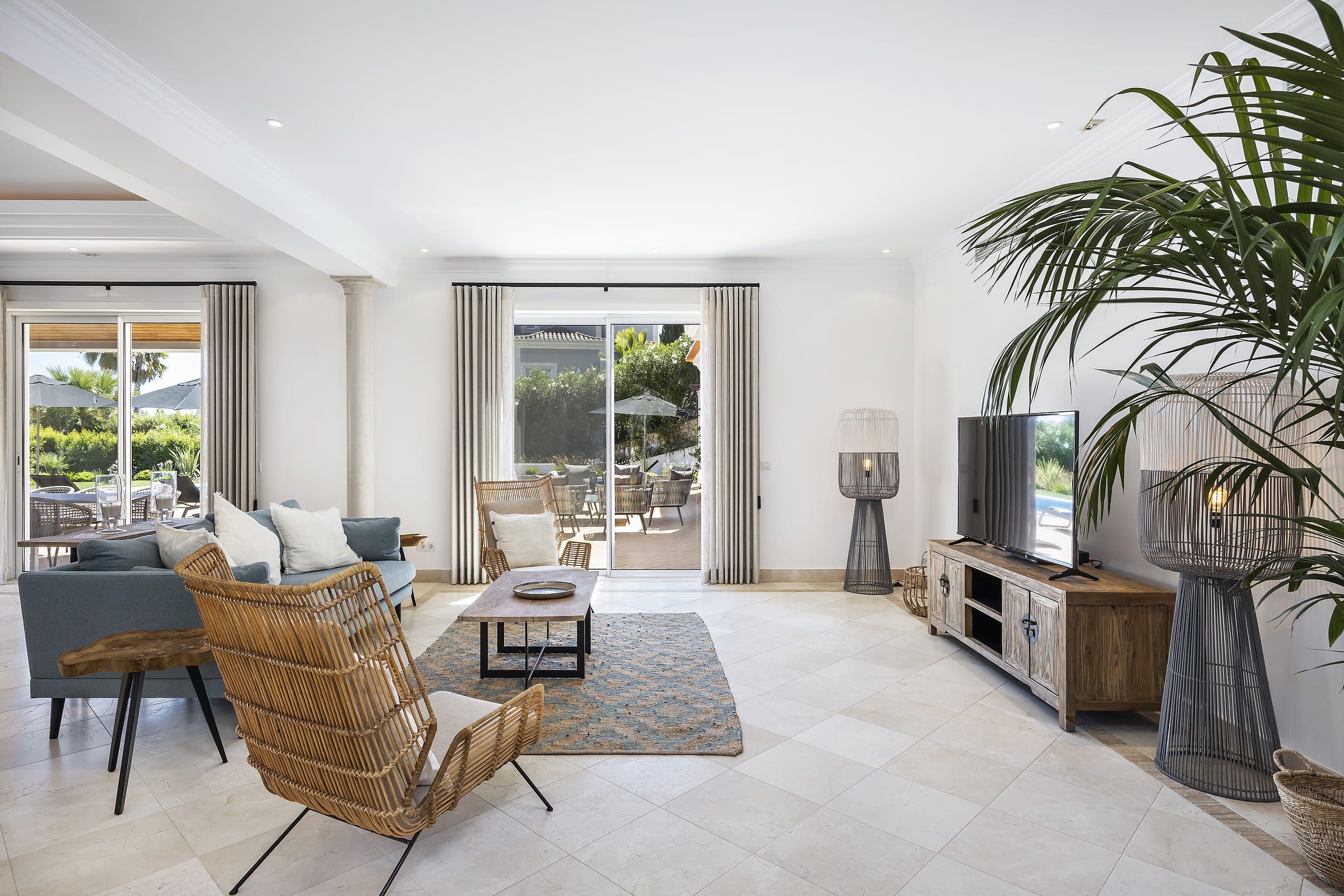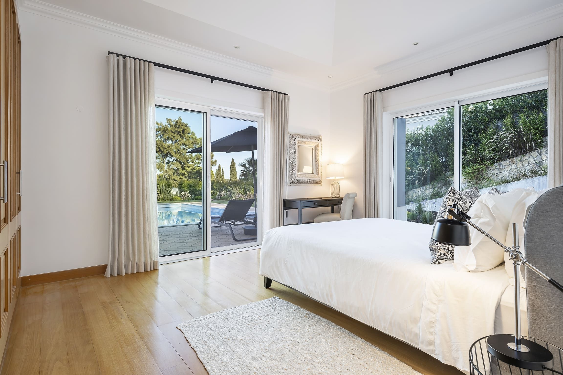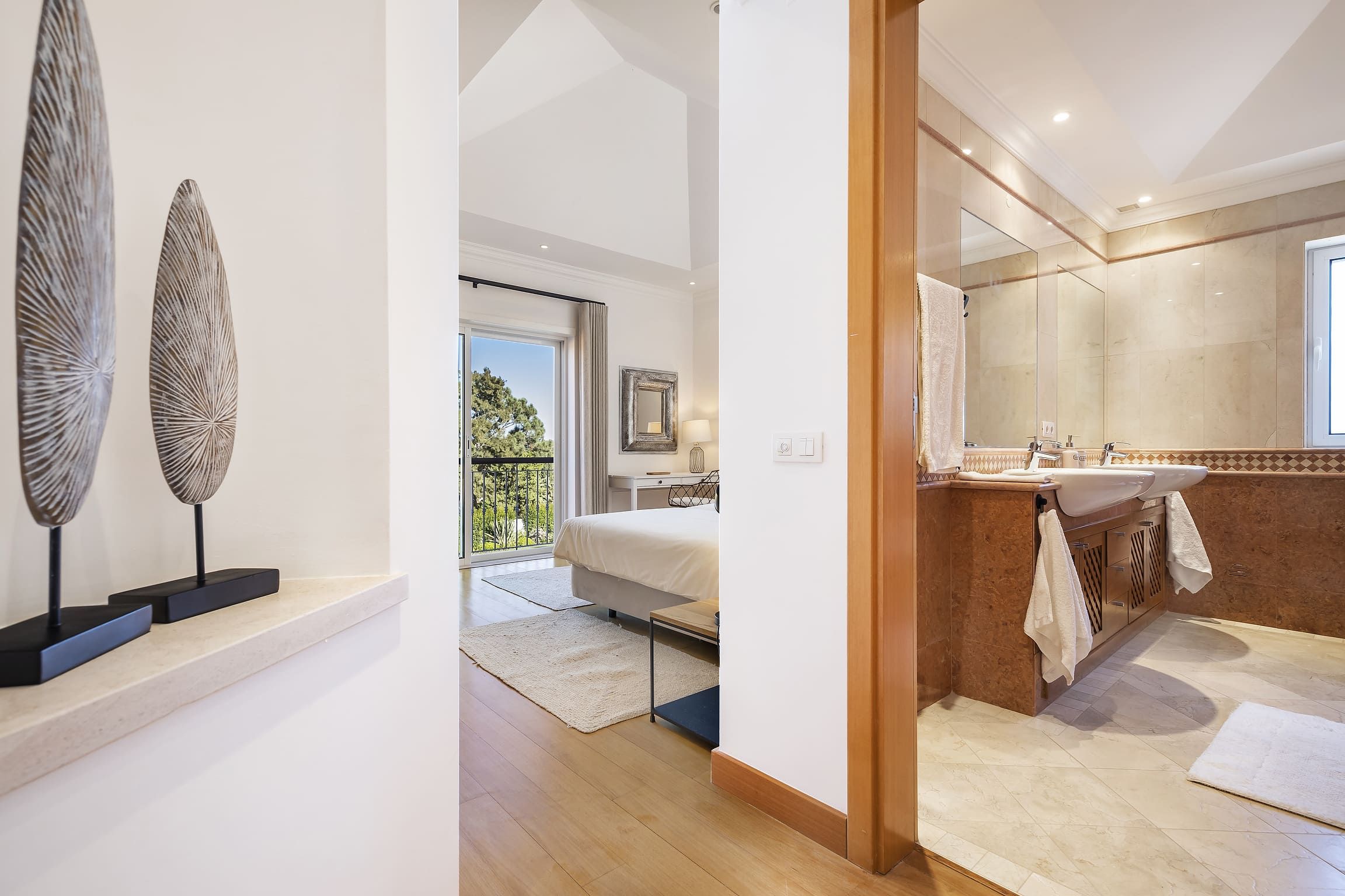 Distribuída por três pisos — cave, piso térreo e primeiro andar — a villa dispõe de cinco quartos em suite, assegurando privacidade e conforto para todos os hóspedes. Os interiores são espaçosos e luminosos, com uma cozinha totalmente equipada e áreas sociais pensadas para relaxamento e convívio. O ar condicionado, aquecimento central e o chão radiante garantem conforto durante todo o ano.