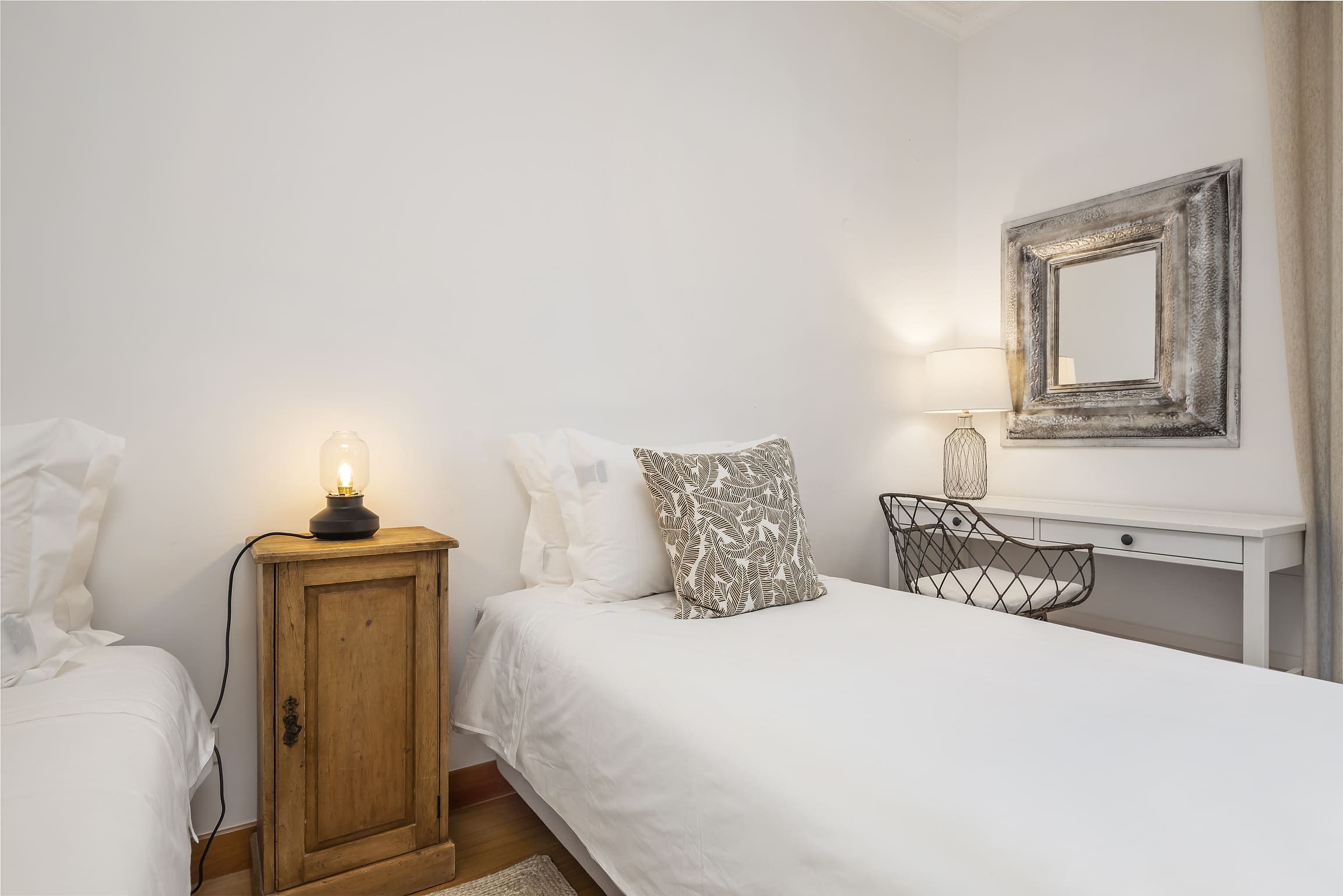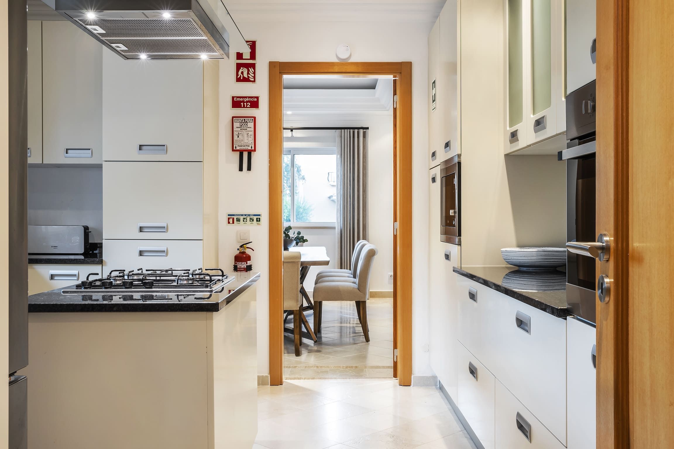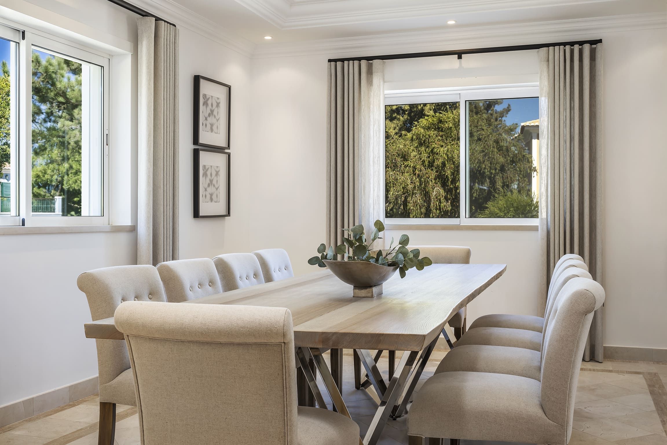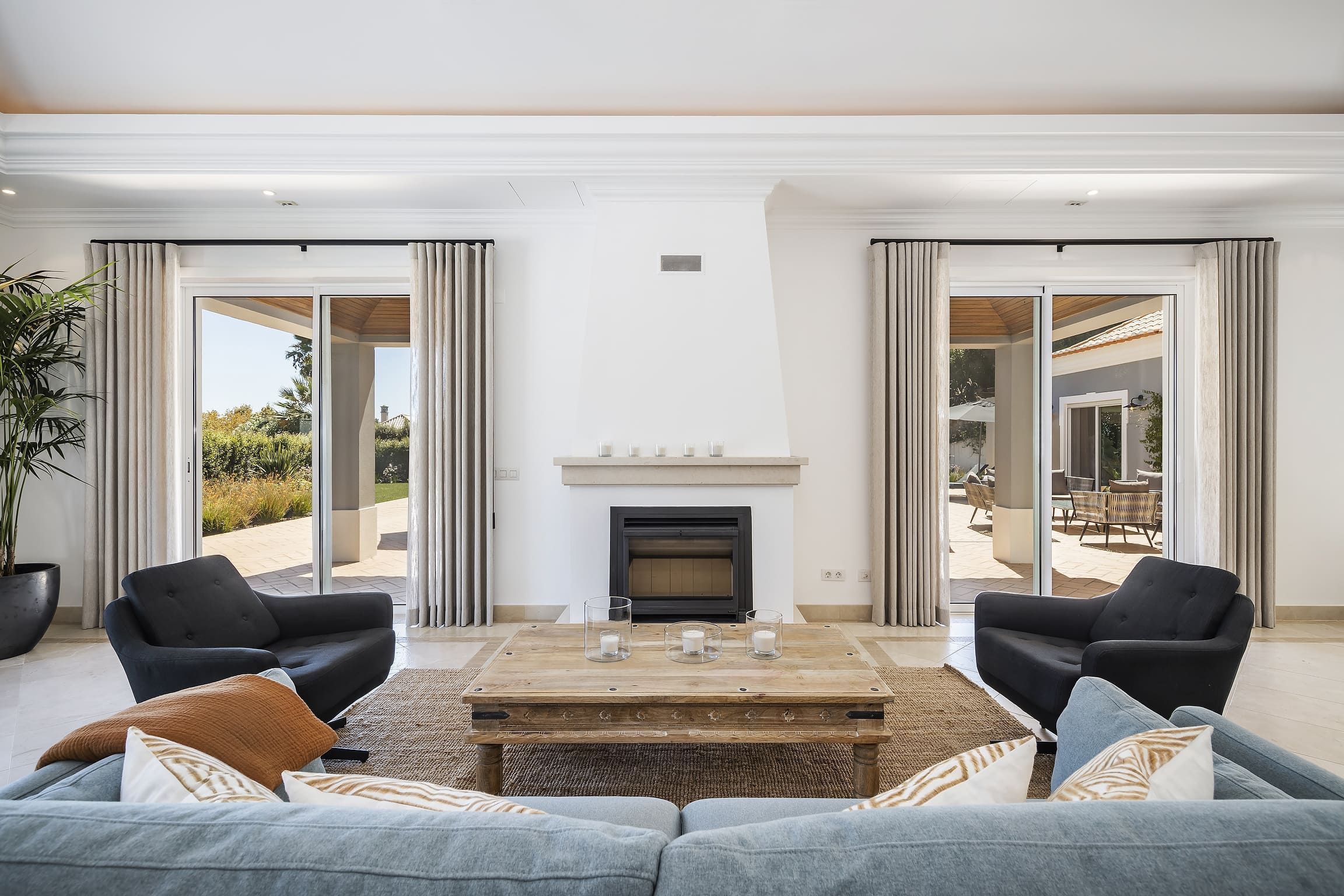 Distribuída por três pisos — cave, piso térreo e primeiro andar — a villa dispõe de cinco quartos em suite, assegurando privacidade e conforto para todos os hóspedes. Os interiores são espaçosos e luminosos, com uma cozinha totalmente equipada e áreas sociais pensadas para relaxamento e convívio. O ar condicionado, aquecimento central e o chão radiante garantem conforto durante todo o ano.