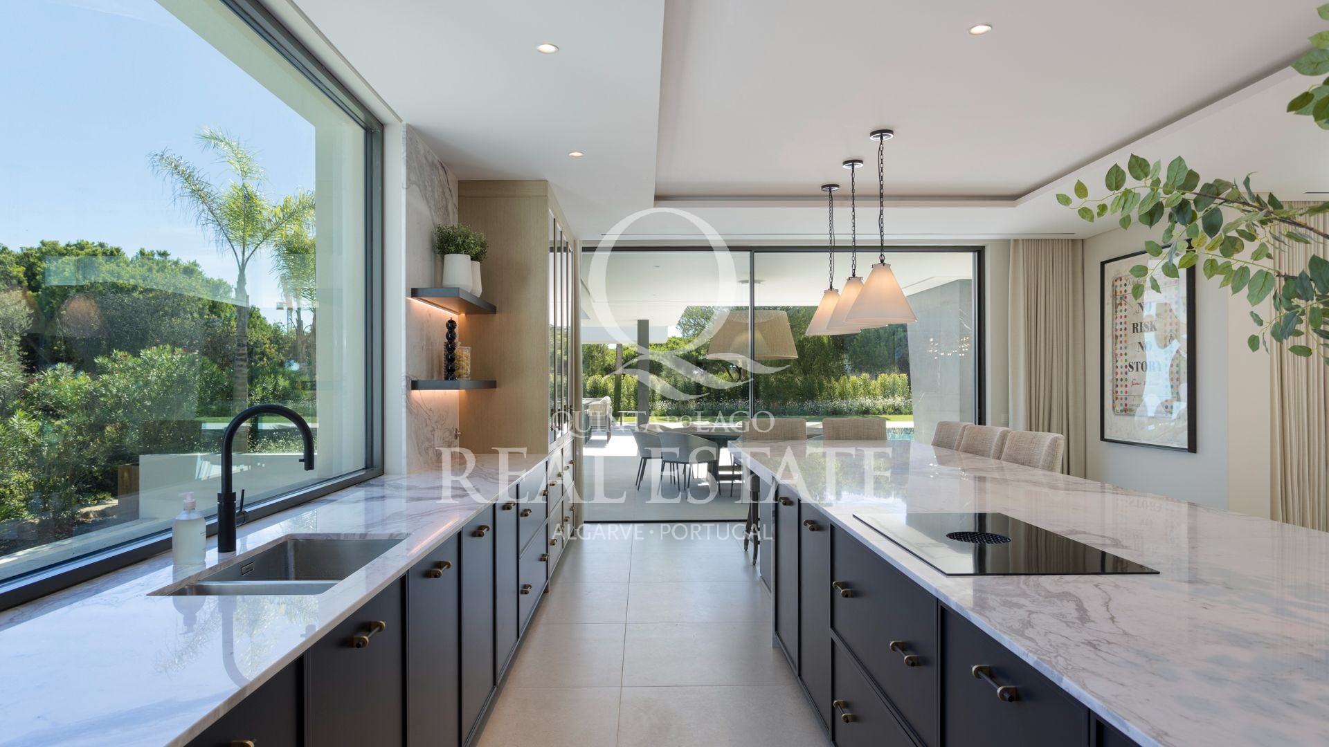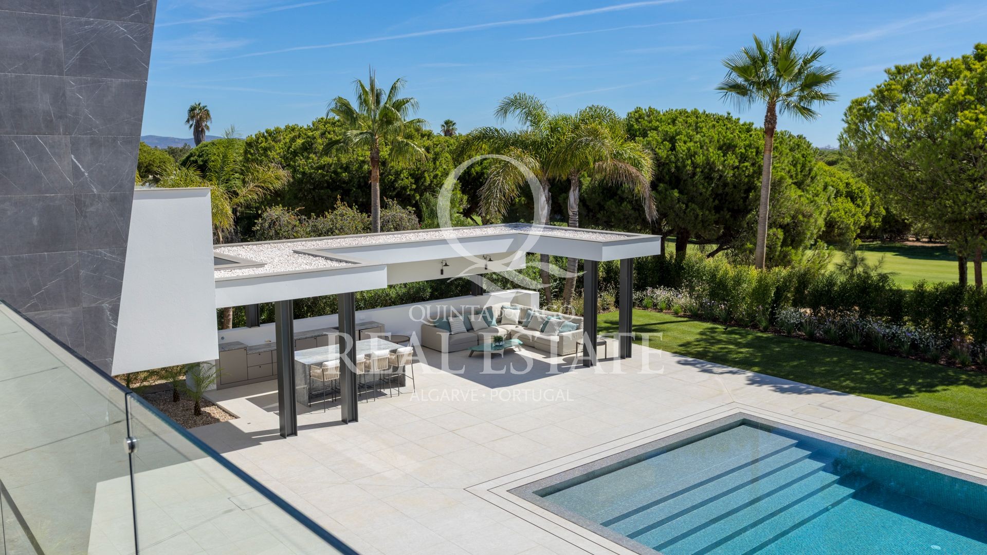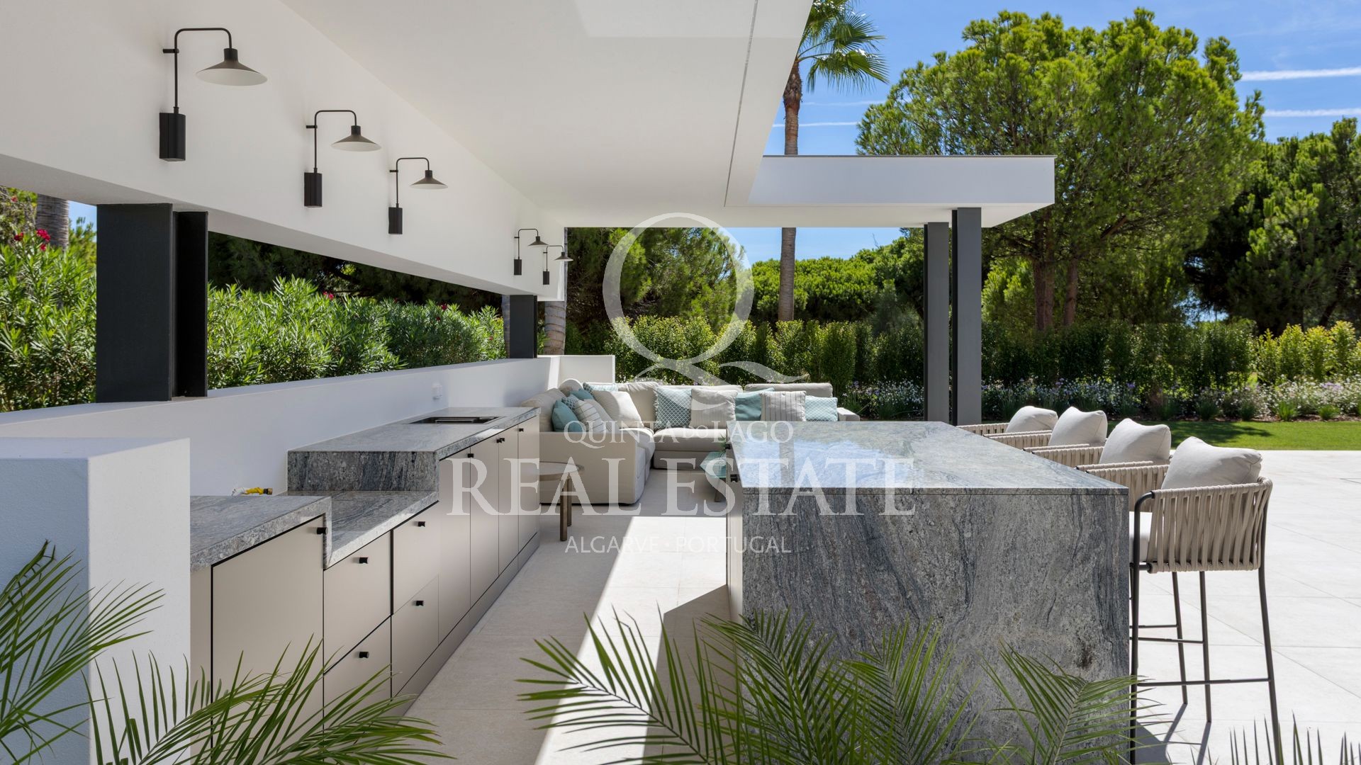 Amplas portas de vidro de correr criam uma transição fluida do interior para o exterior, onde vários terraços, zonas de estar e uma cozinha exterior pré-instalada com barbecue proporcionam o cenário perfeito para momentos de lazer e convívio.